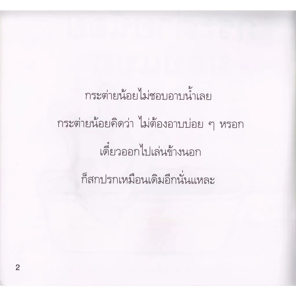 หนังสือเล่มนี้จะพาเด็กๆ ไปพบกันนิทานแสนสนุก พร้อมภาพประกอบสี่สีสวยงาม เรื่อวราวของกระต่ายน้อยไม่ชอบอาบน้ำ ที่แม้จะเล่นมอมแมมอย่างไร ก็ไม่ยอมอาบน้ำจนกระทั่งเพื่อนๆ ไม่กล้าเข้าใกล้และไม่ยอมเล่นด้วยเพราะกระต่ายน้อยสกปรกและมีกลิ่นเหม็นตุๆ นี่ล่ะแล้วกระต่ายน้อยจะยอมอาบน้ำไหมล่ะเนี่ย ติดตามพร้อมกันได้แล้วในเล่ม นำเสนอทั้งภาษาไทยและภาษาอังกฤษ นอกจากได้รับความเพลิดเพลินแล้วยังได้เรียนรู้ภาษาไปพร้อมๆ กันอีกด้วย