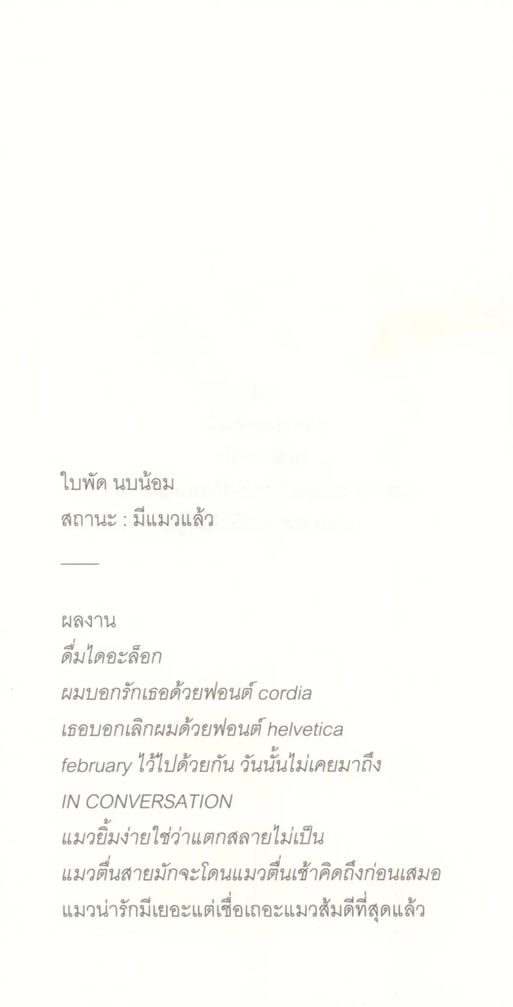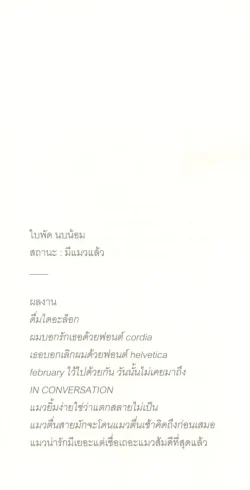 งานเขียนแมวๆ ลำดับที่ 4 ของ ‘ใบพัด นบน้อม’ ที่พูดถึงความสัมพันธ์ระหว่างคนกับแมว ในรูปแบบงานบันทึกห้วงอารมณ์ที่หยิบถ้อยคำในอากาศมาวางบนหน้ากระดาษ สามบรรทัดบ้าง สี่บ้าง บางทีก็มีแค่บรรทัดเดียวผู้เขียนหวังให้หนังสือเล่มนี้เป็นเพื่อนระหว่างเดินทาง จะรอรถ หรือไปทะเล ไว้อ่านฆ่าเวลา เหมาะกับการพกพาไปคาเฟ่ สั่งเครื่องดื่มสักแก้ว แล้วจมลงในถ้อยคำพร้อมรึยังที่จะโดนข่วน!
