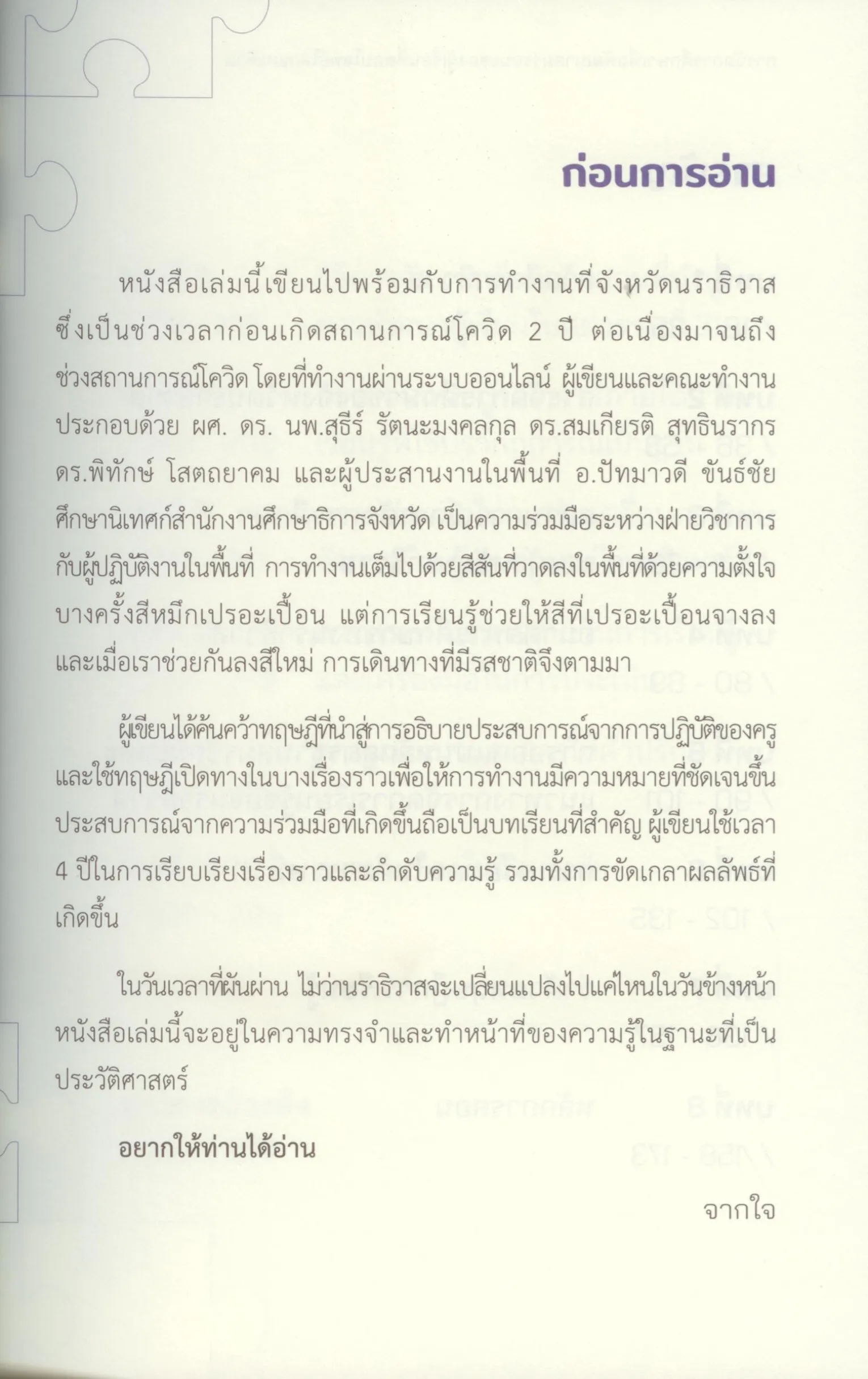 หนังสือเล่มนี้เขียนไปพร้อมกับการทํางานที่จังหวัดนราธิวาสซึ่งเป็นช่วงเวลาก่อนเกิดสถานการณ์โควิด 2 ปี ต่อเนืองมาจนถึงช่วงสถานการณ์โควิด โดยที่ทํางานผ่านระบบออนไลน์ ผู้เขียนและคณะทํางานประกอบด้วย ผศ.ดร.นพ.สุธีร์ รัตนะมงคลกุล ดร.สมเกียรติ สุทธินรากร ดร.พิทักษ์ โสตถยาคม และผู้ประสานงานในพื้นที่ อ.ปัทมาวดี ขันธ์ชัย ศึกษานิเทศก์สํานักงานศึกษาธิการจังหวัด เป็นความร่วมมือระหว่างฝ่ายวิชาการกับผู้ปฏิบัติงานในพื้นที่ การทํางานเต็มไปด้วยสีสันที่วาดลงในพื้นที่ด้วยความตั้งใจบางครั้งสีหมึกเปรอะเปื้อน แต่การเรียนรู้ช่วยให้สีที่เปรอะเปื้อนจางลงและเมื่อเราช่วยกันลงสีใหม่ การเดินทางทีมีรสชาติจึงตามมา