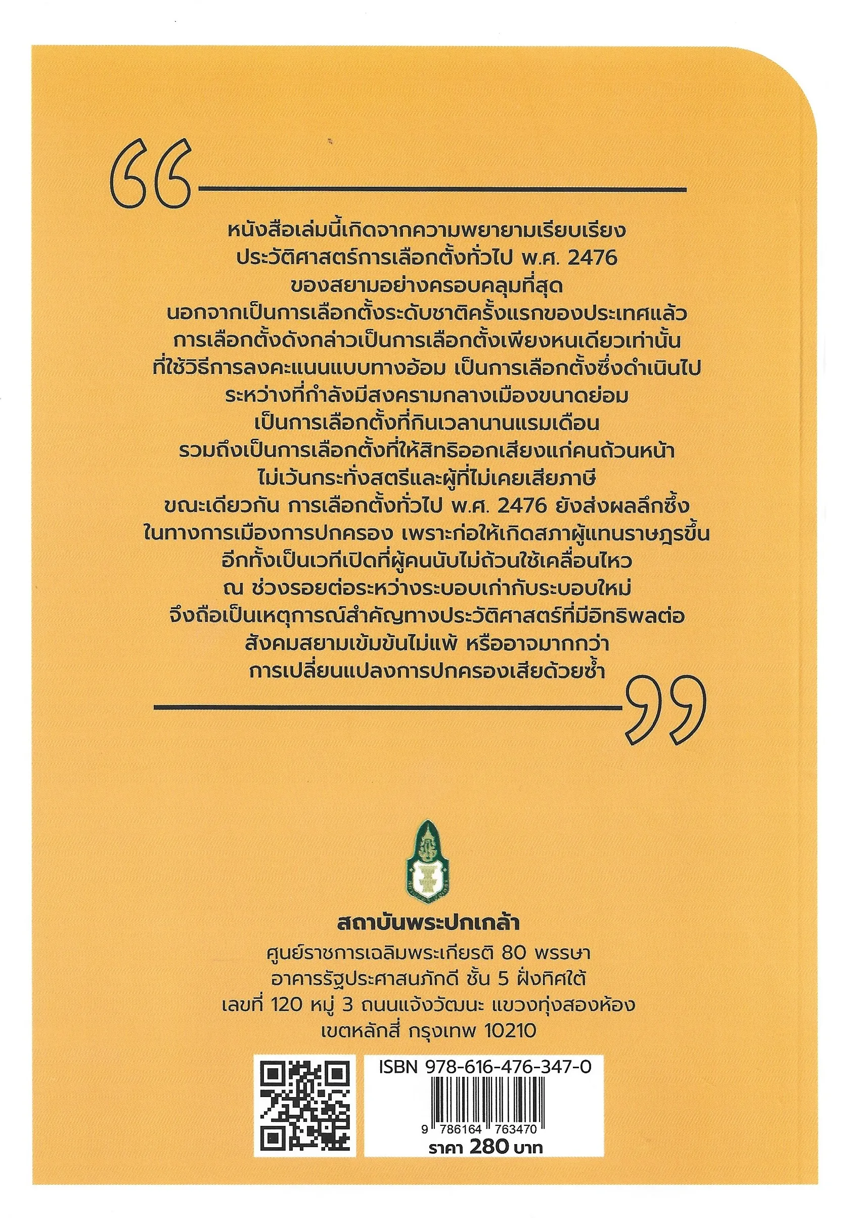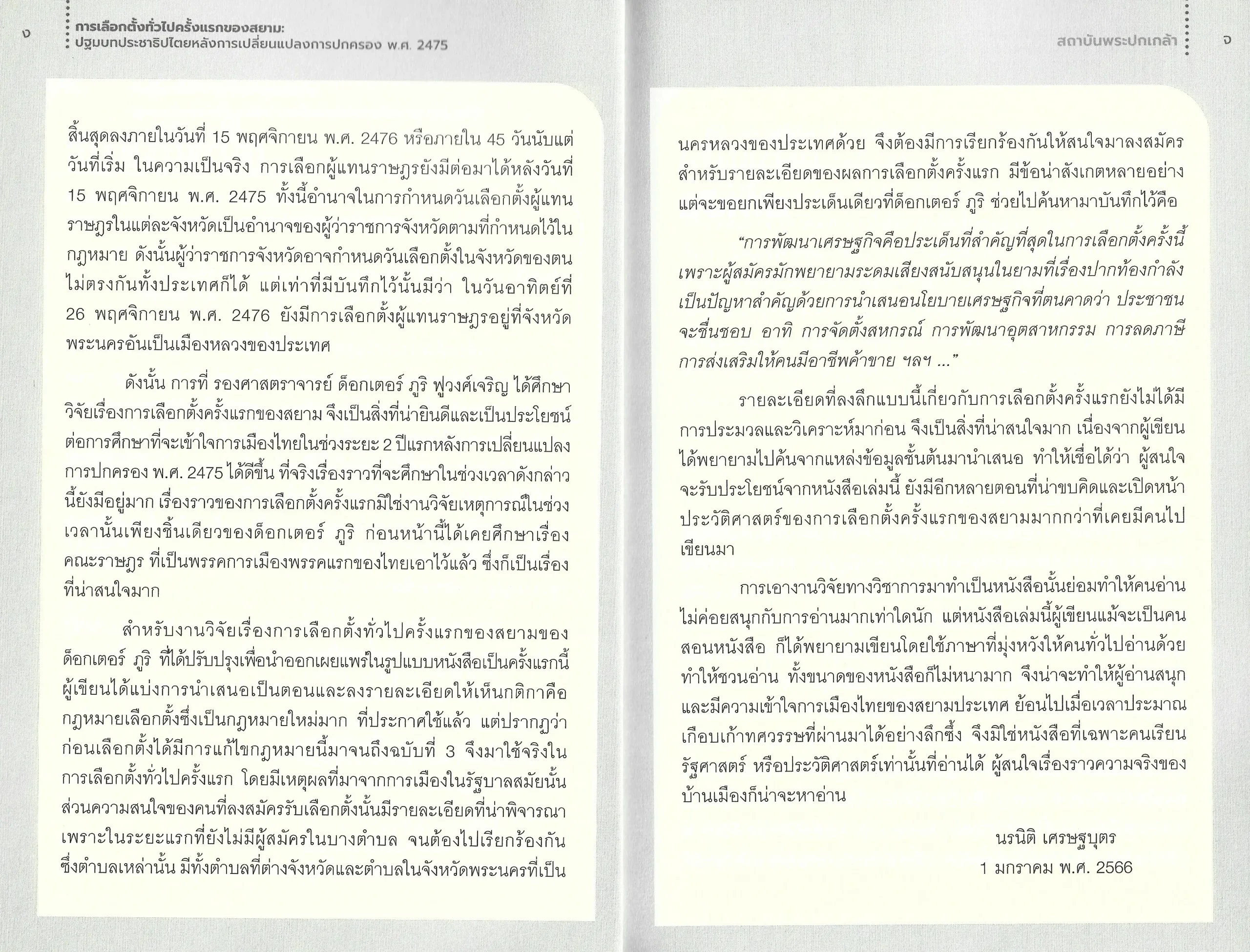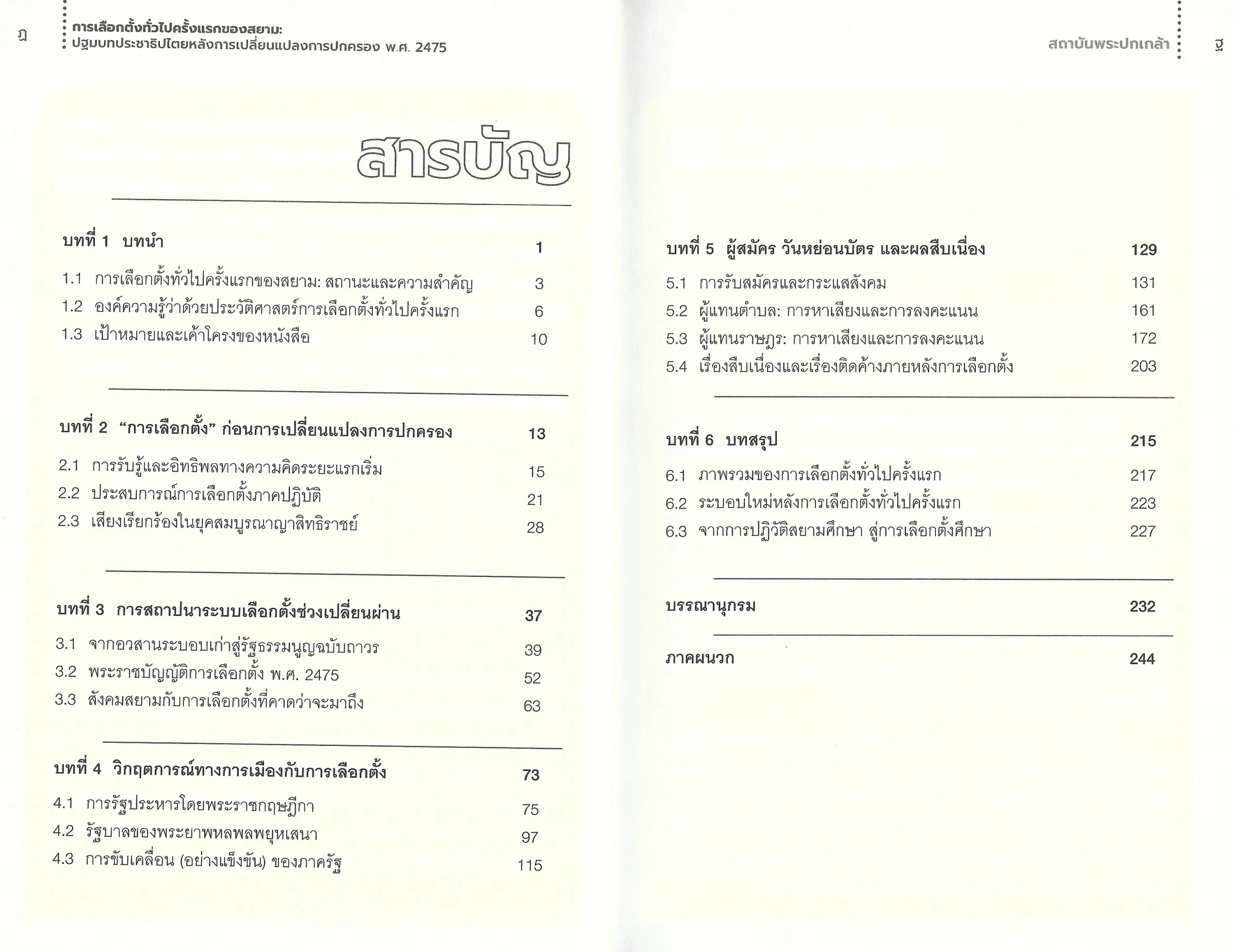 หนังสือเล่มนี้จะพาท่านย้อนกลับไปทำความเข้าใจเหตุการณ์สำคัญอันเป็นผลต่อเนื่องหลังจากเหตุการณ์ปฏิวัติสยามในวันที่ 24 มิถุนายน พ.ศ. 2475 แม้ว่าก่อนหน้านั้นบรรยากาศทางการเมืองของสยามได้มีประสบการณ์การกล่าวถึงการเลือกตั้งหรือผู้แทนราษฎรกันมาบ้างแล้ว แต่เมื่อสายลมของการเปลี่ยนแปลงได้พัดมาถึง การเลือกตั้งในสยามได้เกิดขึ้นจริงหลังการปฏิวัติหาใช่ความฝันละเมออีกต่อไป และการเลือกตั้งนี้คือพื้นที่ที่เปิดให้คนหลายกลุ่มได้เข้ามามีส่วนร่วมทางการเมือง และเป็นเวทีของการช่วงชิง ประชันและแข่งขันให้ได้มาซึ่งชัยชนะทางการเมือง ไม่ว่าจะเป็นชนชั้นนำทั้งเก่าและใหม่ ข้าราชการ และประชาชน ก็ล้วนแล้วต้องเข้ามามีประสบการณ์ร่วมในเหตุการณ์นี้