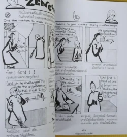 แต่อย่างไรก็ตาม ก็ต้องขอออกตัวในที่นี้เสียก่อนว่า เรื่องราวที่เกี่ยวกับพุทธศาสนาแบบนิกายเซ็นซึ่งจิตรกรนักวาดการ์ตูนขีดเขียนเป็นลายเส้นอิสระเรียบง่ายนั้น เป็นแบบอย่างของการเขียนการ์ตูนที่ฉับไว อันเกิดจากสมาธิจิตอันแน่วแน่ เส้นทุกเส้นหรือส่วนประกอบของภาพที่ปรากฎให้เห็นจะให้ความหมายได้ทั้งหมด คำบรรยายประกอบภาพจะสั้นแต่กินความลึกหลายๆ คำ
