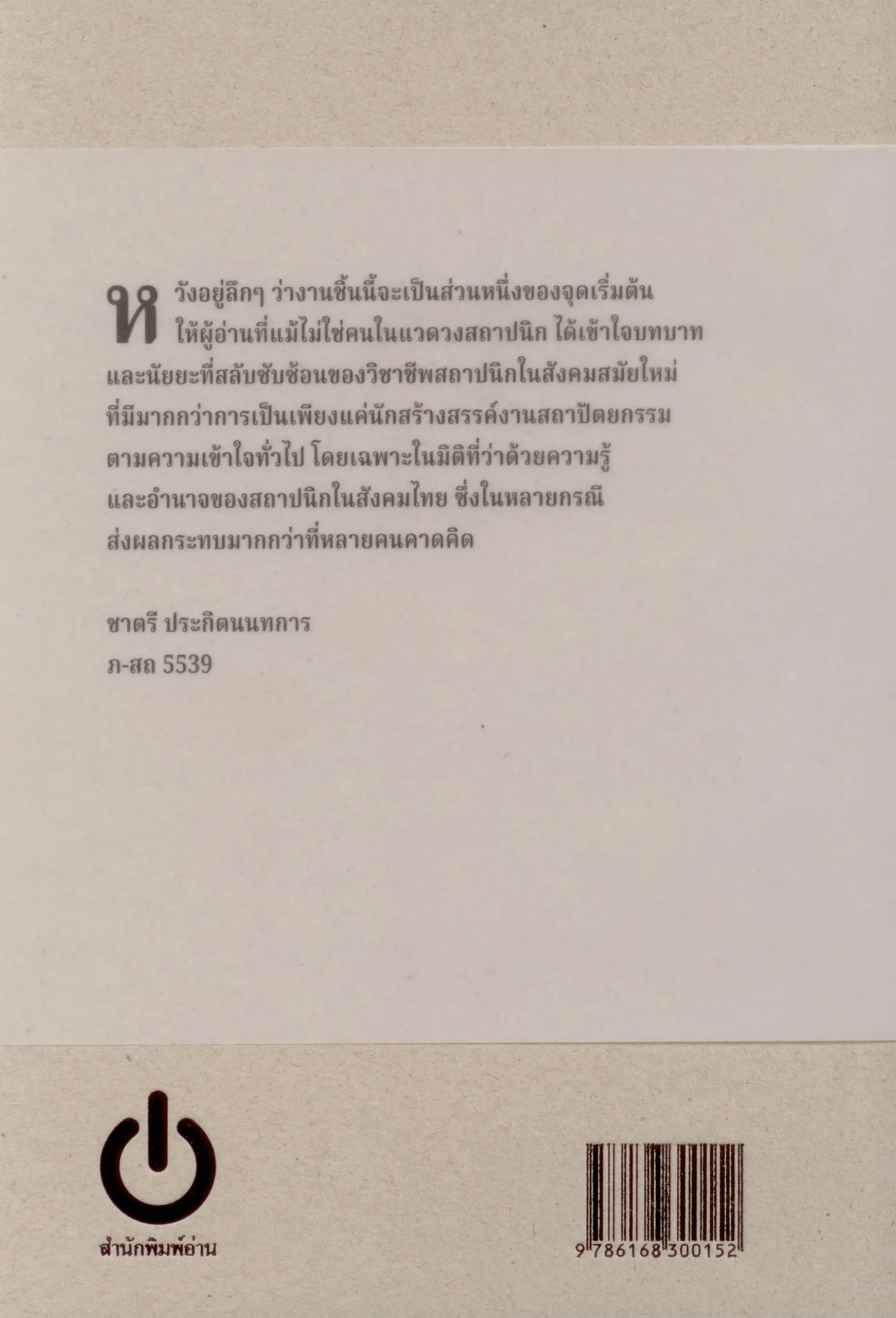 ความคิดนี้ได้ทำให้ผู้เขียนย้อนกลับไปมองงานวิจัยชิ้นนี้ใหม่และเริ่มปรับปรุงต้นฉบับที่ถูกทิ้งไว้นานถึงเจ็ดปีอีกครั้ง ผู้เขียนเริ่มคิดว่า งานชิ้นนี้อาจจะมีประโยชน์อยู่บ้างถ้าได้รับการตีพิมพ์เผยแพร่แก่ผู้อ่านทั่วไป โดยหวังอยู่ลึกๆ ว่างานชิ้นนี้จะเป็นส่วนหนึ่งของจุดเริ่มต้นให้ผู้อ่านที่แม้ไม่ใช่คนในแวดวงสถาปนิก ได้เข้าใจบทบาทและนัยยะที่สลับซับซ้อนของวิชาชีพสถาปนิกในสังคมสมัยใหม่ที่มีมากกว่าการเป็นเพียงแค่นักสร้างสรรค์งานสถาปัตยกรรมตามความเข้าใจทั่วไป โดยเฉพาะในมิติที่ว่าด้วยความรู้และอำนาจของสถาปนิกในสังคมไทย ซึ่งในหลายกรณีส่งผลกระทบมากกว่าที่หลายคนคาดคิด