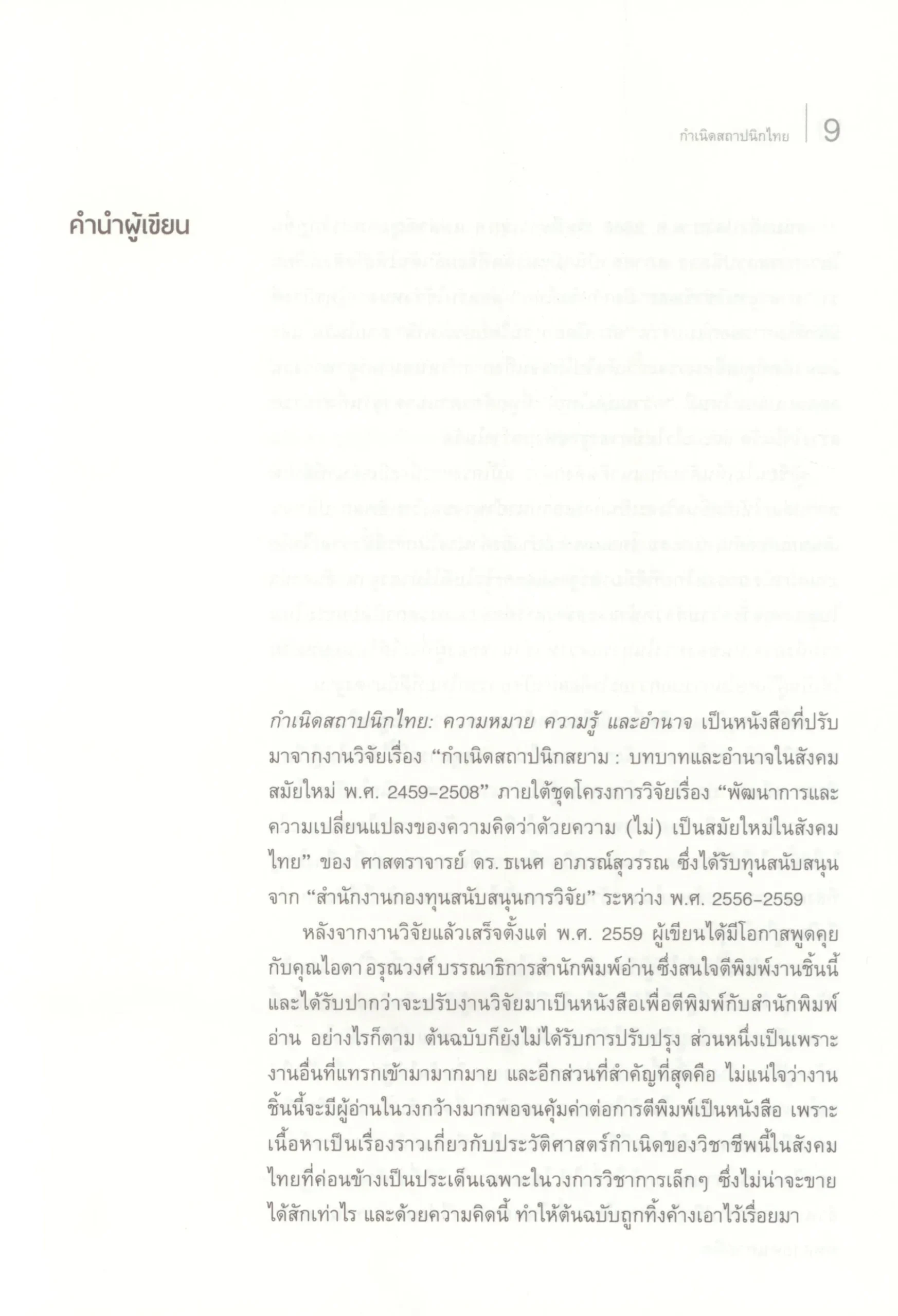 กำเนิดสถาปนิกไทย: ความหมาย ความรู้ และอำนาจ เป็นหนังสือที่ปรับมาจากงานวิจัยเรื่อง “กำเนิดสถาปนิกสยาม : บทบาทและอำนาจในสังคมสมัยใหม่ พ.ศ. 2459-2508” ภายใต้ชุดโครงการวิจัยเรื่อง “พัฒนาการและความเปลี่ยนแปลงของความคิดว่าด้วยความ (ไม่) เป็นสมัยใหม่ในสังคมไทย” ของ ศาสตราจารย์ ดร. ธเนศ อาภรณ์สุวรรณ ซึ่งได้รับทุนสนับสนุนจาก “สำนักงานกองทุนสนับสนุนการวิจัย” ระหว่าง พ.ศ. 2556-2559
