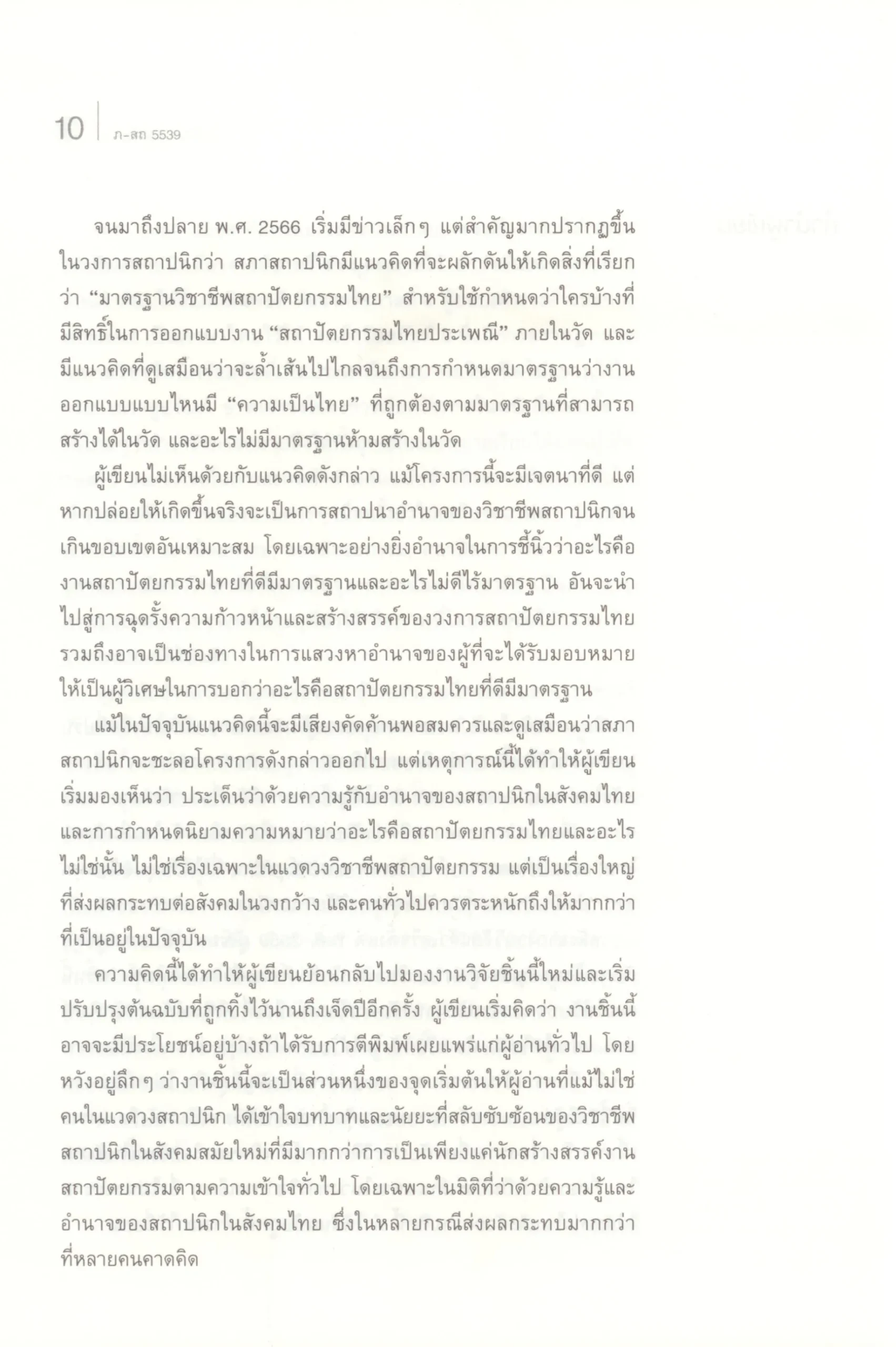 จนมาถึงปลาย พ.ศ. 2566 เริ่มมีข่าวเล็กๆ แต่สำคัญมากปรากฏขึ้นในวงการสถาปนิกว่า สภาสถาปนิกมีแนวคิดที่จะผลักดันให้เกิดสิ่งที่เรียกว่า “มาตรฐานวิชาชีพสถาปัตยกรรมไทย” สำหรับใช้กำหนดว่าใครบ้างที่มีสิทธิ์ในการออกแบบงาน “สถาปัตยกรรมไทยประเพณี” ภายในวัด และมีแนวคิดที่ดูเสมือนว่าจะล้ำเส้นไปไกลจนถึงการกำหนดมาตรฐานว่างานออกแบบแบบไหนมี “ความเป็นไทย” ที่ถูกต้องตามมาตรฐานที่สามารถสร้างได้ในวัด และอะไรไม่มีมาตรฐานห้ามสร้างในวัด