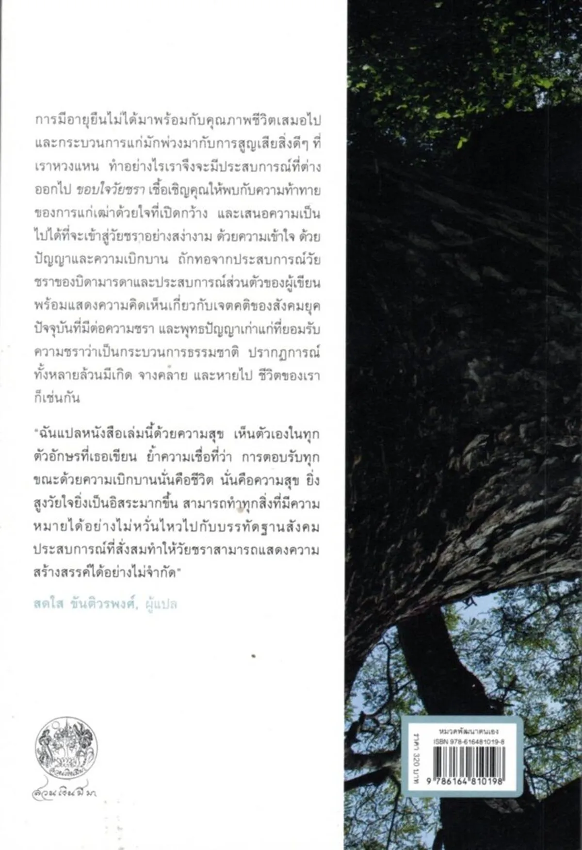 การมีอายุยืนไม่ได้มาพร้อมกับคุณภาพชีวิตเสมอไปและกระบวนการแก่มักพ่วงมากับการสูญเสียสิ่งดีๆ ที่เราหวงแหน ทำอย่างไรเราจึงจะมีประสบการณ์ที่ต่างออกไป ขอบใจวัยชรา เชื้อเชิญคุณให้พบกับความท้าทายของการแก่เฒ่าด้วยใจที่เปิดกว้าง และเสนอความเป็นไปได้ที่จะเข้าสู่วัยชราอย่างสง่างาม ด้วยความเข้าใจ ด้วยปัญญาและความเบิกบาน ถักทอจากประสบการณ์วัยชราของบิดามารดาและประสบการณ์ส่วนตัวของผู้เขียนพร้อมแสดงความคิดเห็นเกี่ยวกับเจตคติของสังคมยุค ปัจจุบันที่มีต่อความชรา และพุทธปัญญาเก่าแก่ที่ยอมรับความชราว่าเป็นกระบวนการธรรมชาติ ปรากฏการณ์ทั้งหลายล้วนมีเกิด จางคลาย และหายไป ชีวิตของเราก็เช่นกัน