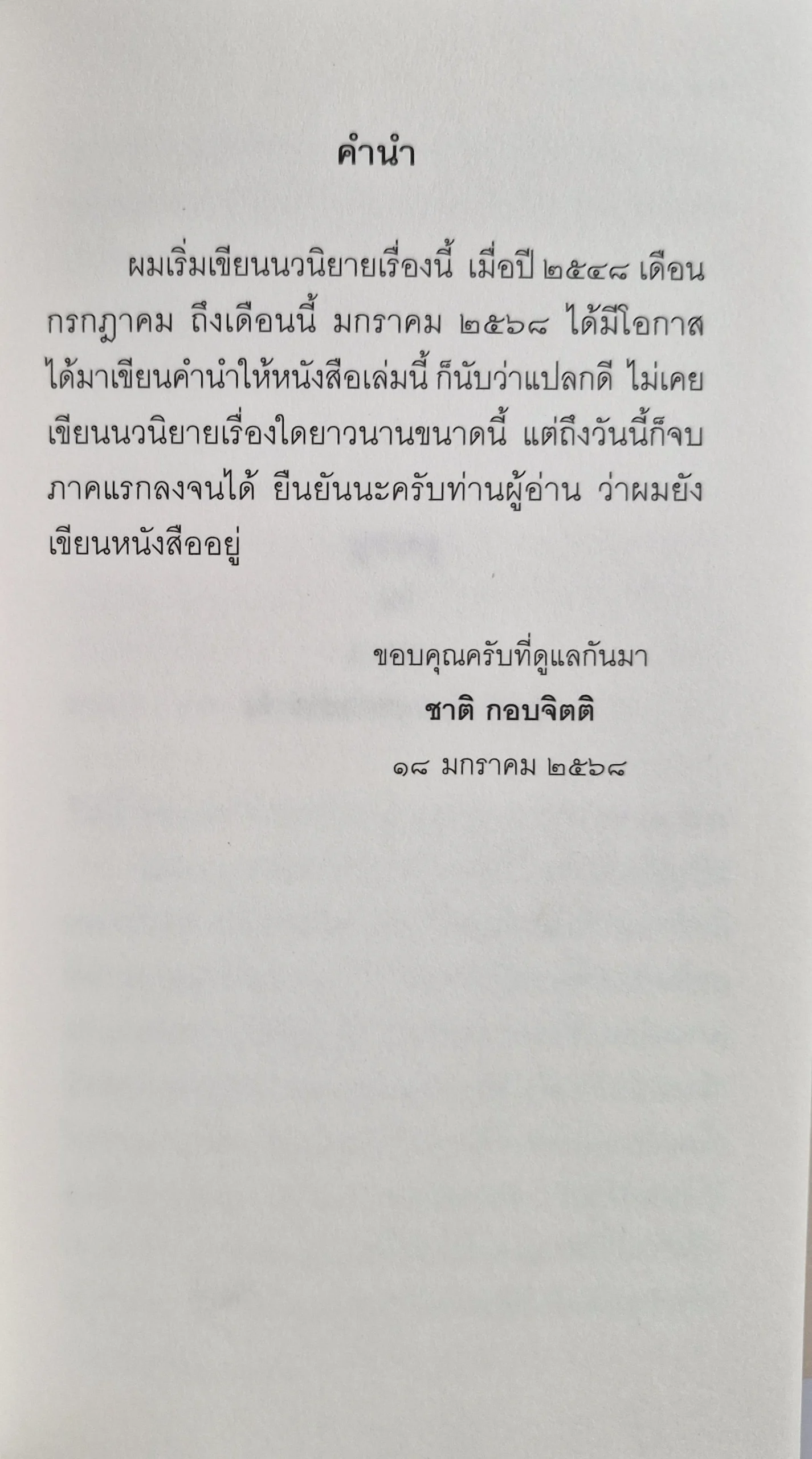 ผมเริ่มเขียนนวนิยายเรื่องนี้ เมื่อปี 2548 เดือน กรกฎาคม ถึงเดือนนี้ มกราคม 2568 ได้มีโอกาส ได้มาเขียนคำนำให้หนังสือเล่มนี้ก็นับว่าแปลกดี ไม่เคยเขียนนวนิยายเรื่องใดยาวนานขนาดนี้ แต่ถึงวันนี้ก็จบภาคแรกลงจนได้ ยืนยันนะครับท่านผู้อ่าน ว่าผมยังเขียนหนังสืออยู่