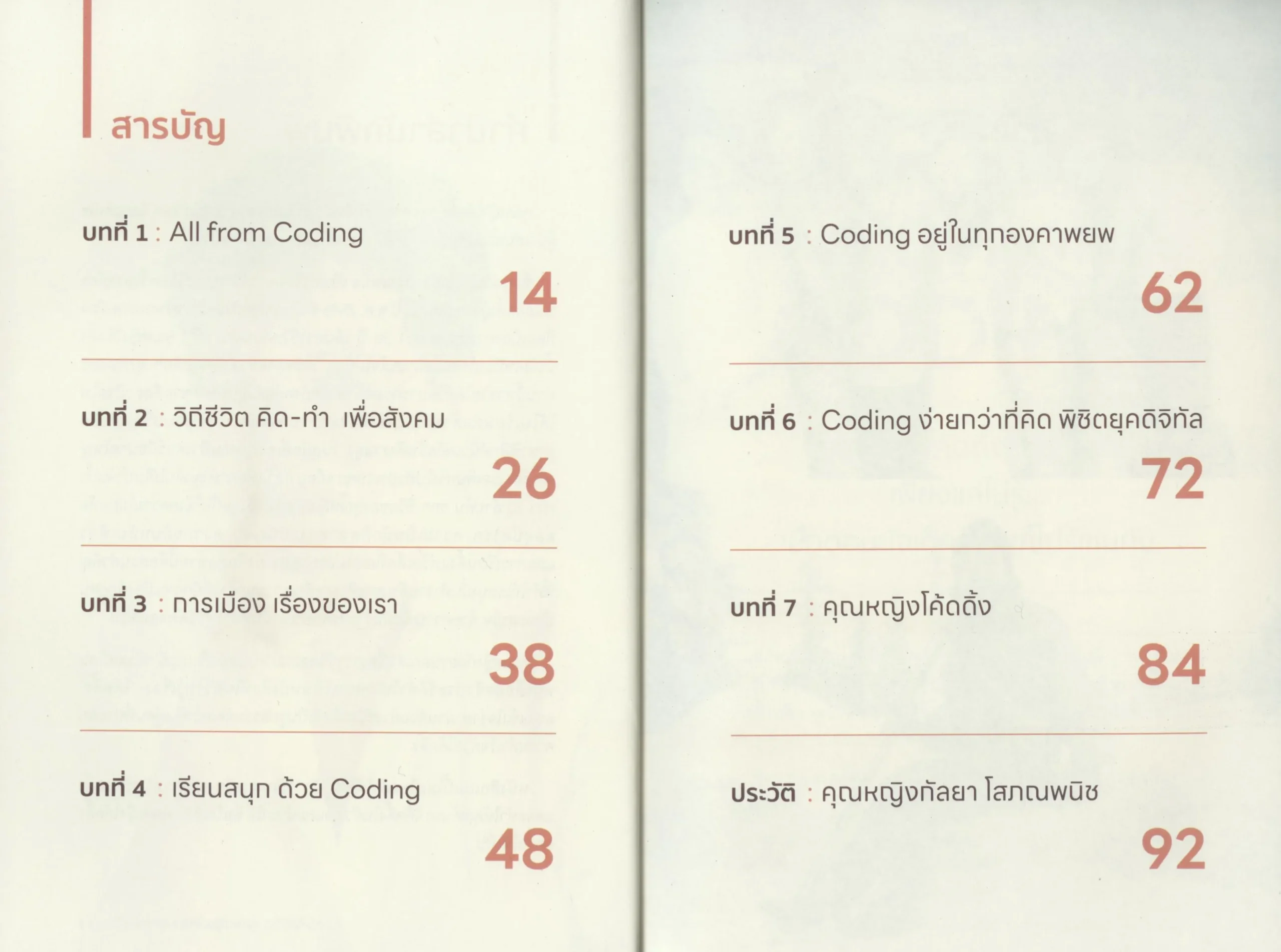 หนังสือเล่มนี้ เป็นการตกผลึกจากประสบการณ์และเส้นทางชีวิตของดิฉันเอง ถ่ายทอดแนวคิดเกี่ยวกับ “Unplugged Coding” หรือโค้ดดิ้งที่ไม่ต้องใช้คอมพิวเตอร์ แต่สามารถฝึกฝนได้จากชีวิตประจำวัน เพราะดิฉันเชื่อว่า โค้ดดิ้งอยู่ในทุกจังหวะของชีวิตเรา เพียงแต่เรายังไม่เคยตระหนักถึงมัน