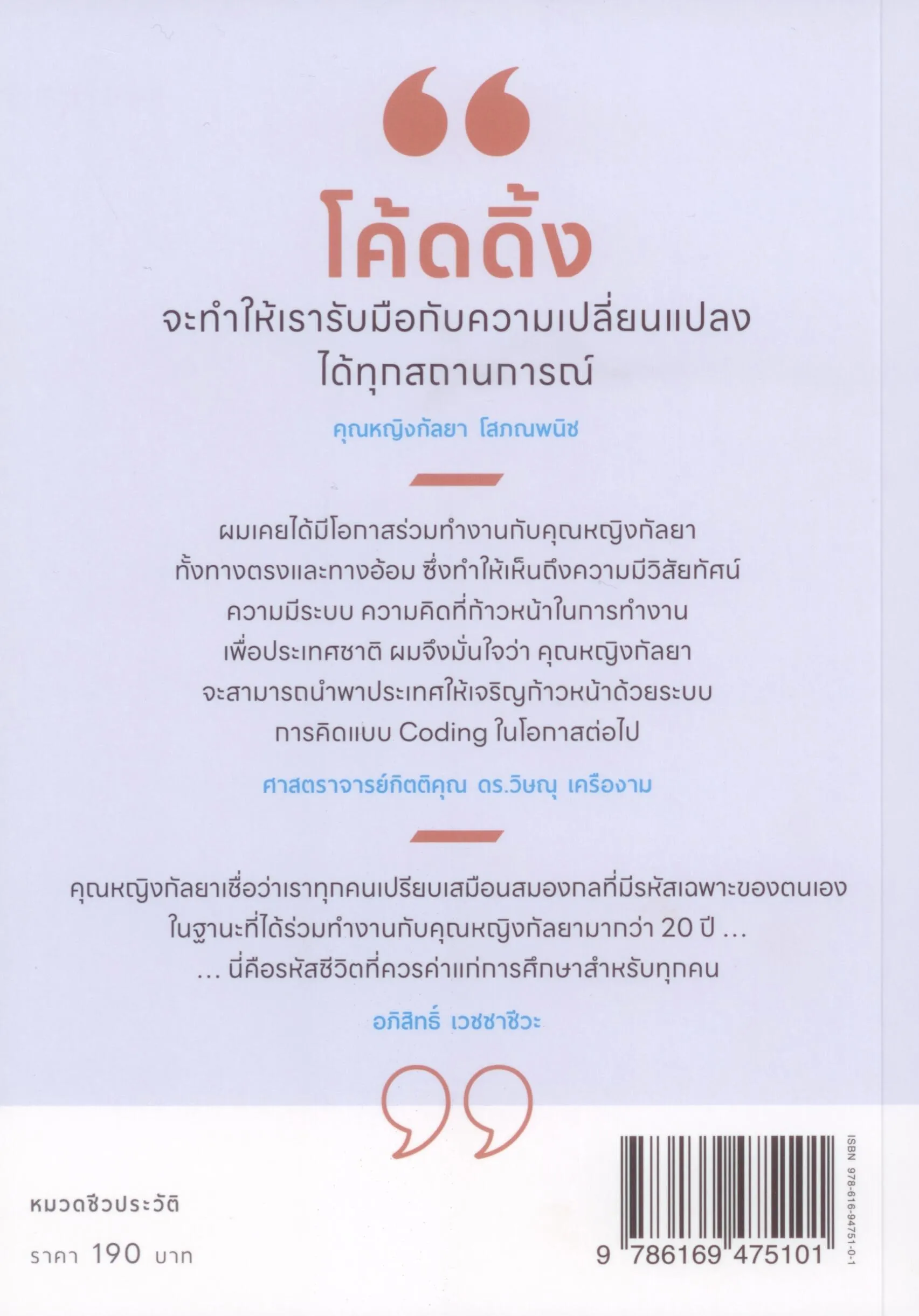 คุณหญิงกัลยาเชื่อว่าเราทุกคนเปรียบเสมือนสมองกลที่มีรหัสเฉพาะของตนเอง ในฐานะที่ได้ร่วมทำงานกับคุณหญิงกัลยามามากว่า 20 ปี…นี่คือรหัสชีวิตที่ควรค่าแก่การศึกษาสำหรับทุกคน