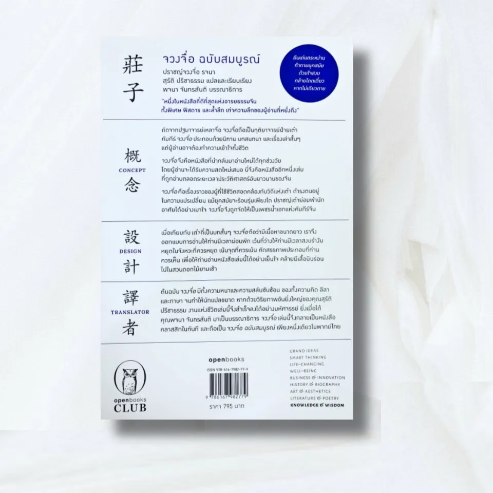 ต้นฉบับ “จวงจื่อ” มีทั้งความหนาและความสลับซับซ้อน ของทั้งความคิด ลีลา และภาษา จนทำให้นักแปลขยาด หากด้วยวิริยภาพอันยิ่งใหญ่ของ “คุณสุรัติ ปรีชาธรรม” งานแห่งชีวิตเล่มนี้จึงสำเร็จลงได้อย่างมหัศจรรย์ ยิ่งเมื่อได้ “คุณพจนา จันทรสันติ” มาเป็นบรรณาธิการ จวงจื่อเล่มนี้จึงกลายเป็นหนังสือคลาสสิกในทันที และถือเป็น “จวงจื่อ ฉบับสมบูรณ์” เพียงหนึ่งเดียวในพากย์ไทย