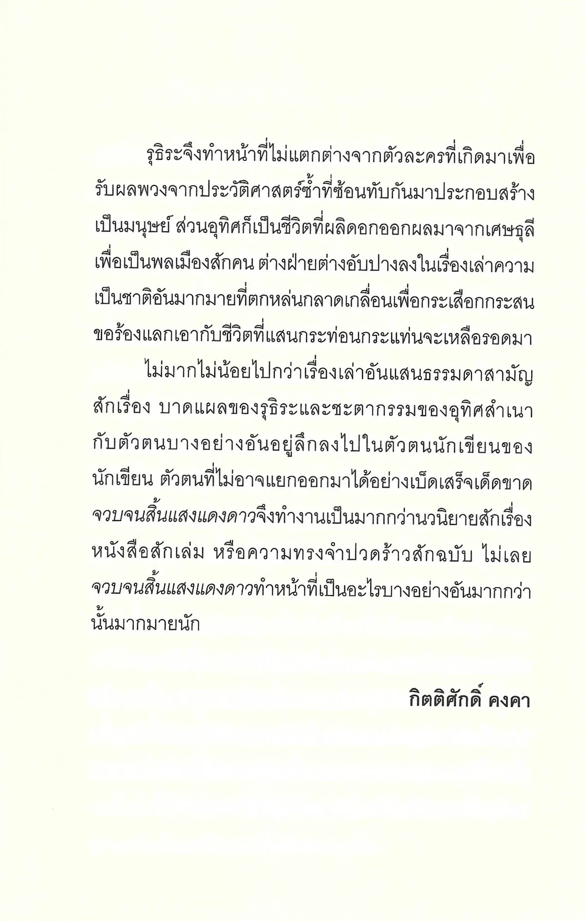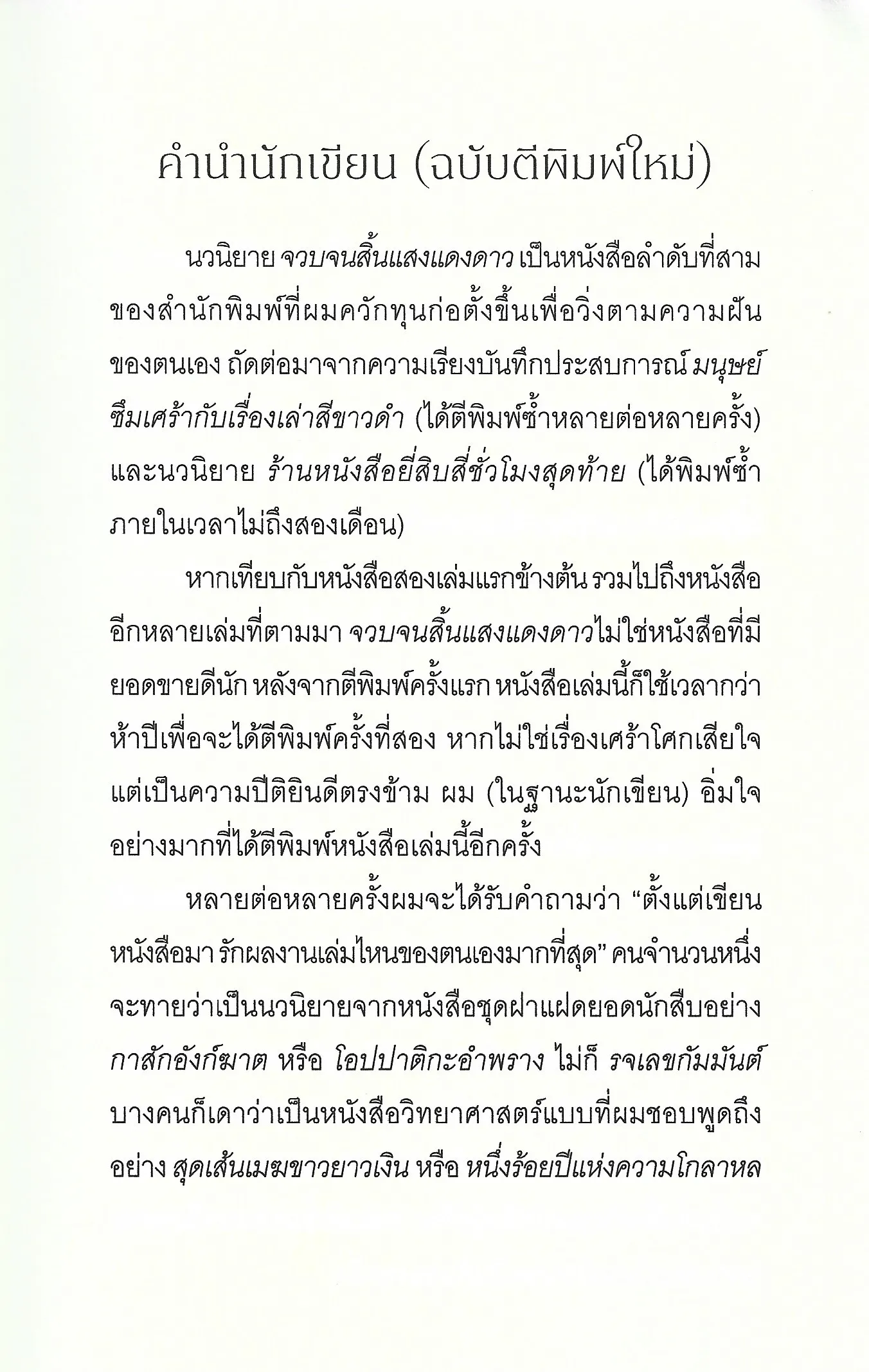 “…หลายต่อหลายครั้งผมจะได้รับคำถามว่า “ตั้งแต่เขียนหนังสือมารักผลงานเล่มไหนของตนเองมากที่สุด” … หากจะพูดถึงแค่ในแง่นักเขียนหนึ่งคน นักเขียนที่ไม่รู้ว่าหนังสือสักเล่มจะพาตัวเองไปไหนได้บ้าง นักเขียนที่ขึ้นสูงลงต่ำเหาะเหินและตกระกำลำบากไปกับตัวอักษร ผมคงต้องตอบว่า จวบจนสิ้นแสงแดงดาว…ผมยกให้จวบจนสิ้นแสงแดงดาว เป็นหนังสือที่ผมรักที่สุดในฐานะนักเขียนคนหนึ่ง”