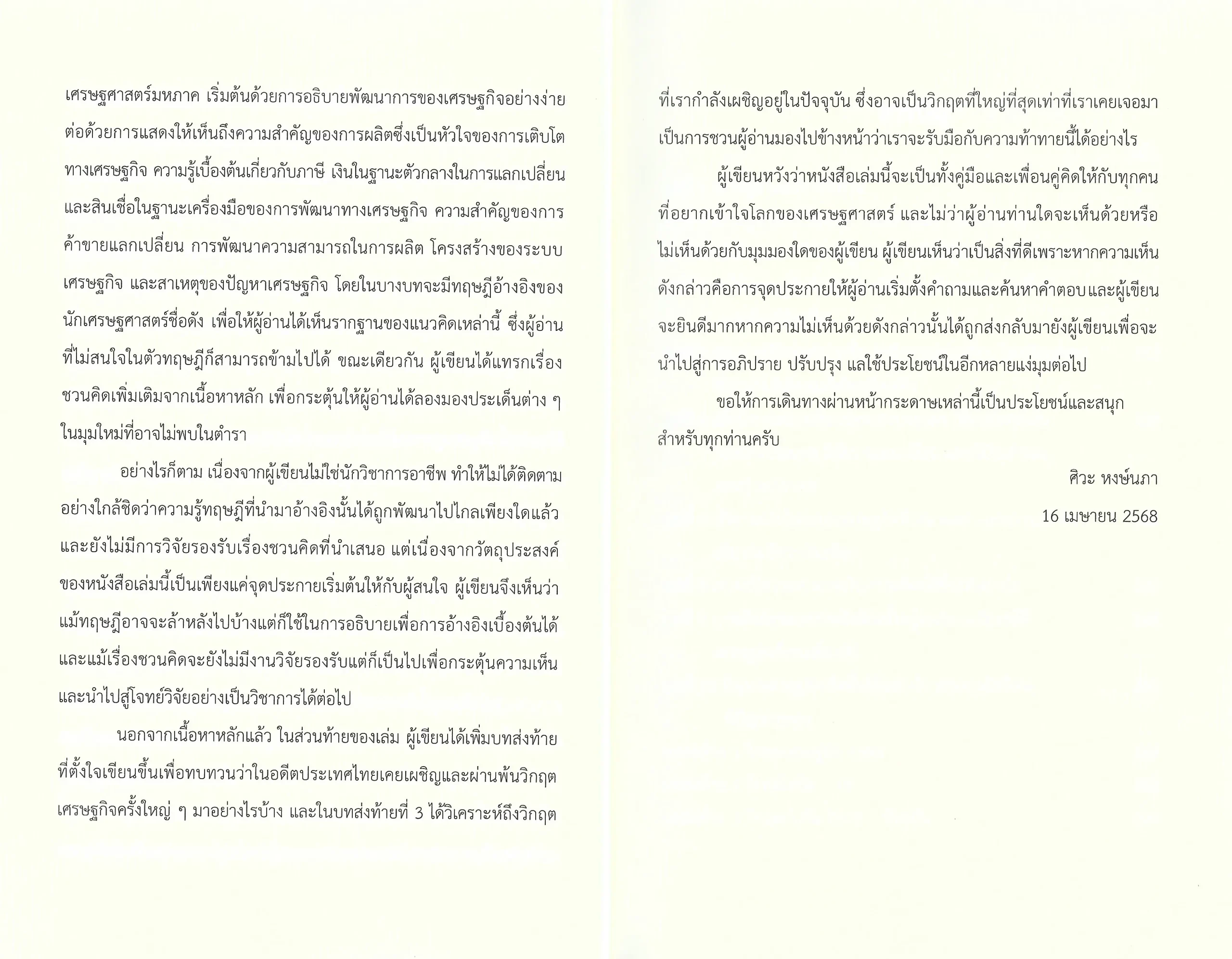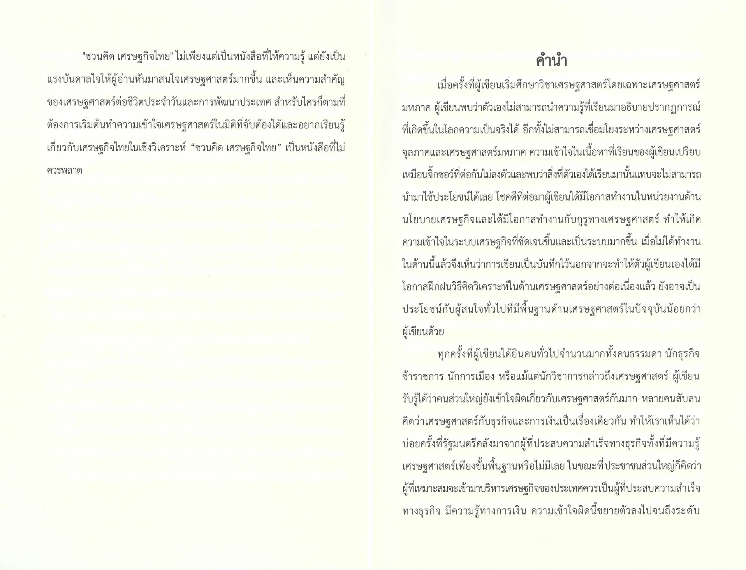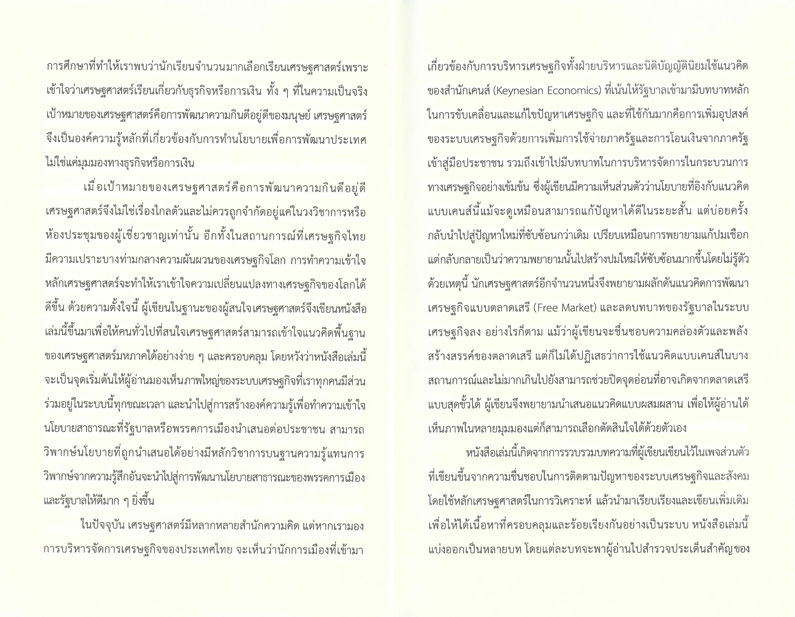 หนังสือเล่มนี้เกิดจากการรวบรวมบทความที่ผู้เขียนเขียนไว้ในเพจส่วนตัวที่เขียนขึ้นจากความชื่นชอบในการติดตามปัญหาของระบบเศรษฐกิจและสังคมโดยใช้หลักเศรษฐศาสตร์ในการวิเคราะห์ แล้วนำมาเรียบเรียงและเขียนเพิ่มเติมเพื่อให้ได้เนื้อหาที่ครอบคลุมและร้อยเรียงกันอย่างเป็นระบบ หนังสือเล่มนี้แบ่งออกเป็นหลายบท โดยแต่ละบทจะพาผู้อ่านไปสำรวจประเด็นสำคัญของเศรษฐศาสตร์มหภาค