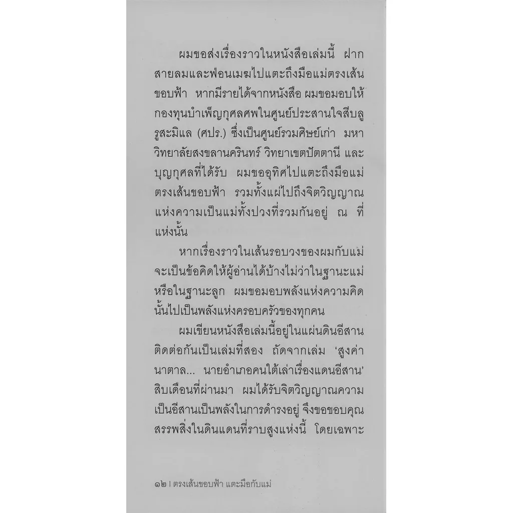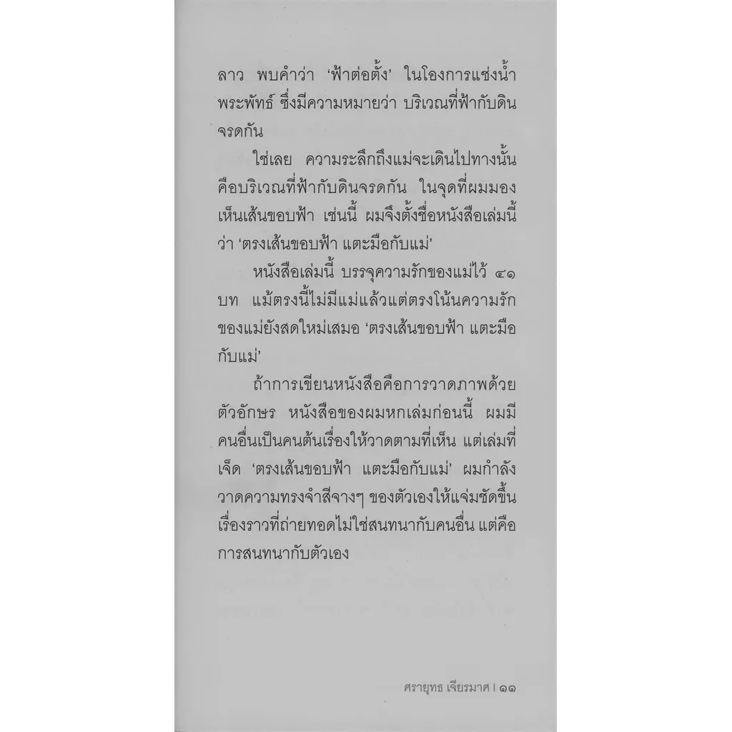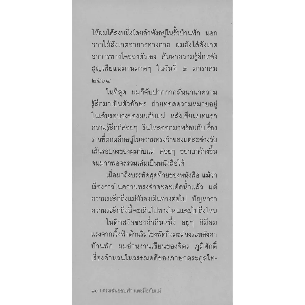 หนังสือเล่มนี้ บรรจุความรักของแม่ไว้ 41 บท แม้ตรงนี้ไม่มีแม่แล้วแต่ตรงโน้นความรักของแม่ยังสดใสเสมอ ‘ตรงเส้นขอบฟ้าแตะมือกับแม่’ ผมกำลังวาดภาพความทรงจำสีจางๆของตัวเองให้แจ่มชัดขึ้น เรื่องราวที่ถ่ายทอดไม่ใช่สนทนากับคนอื่น แต่คือการสนทนากับตัวเอง
