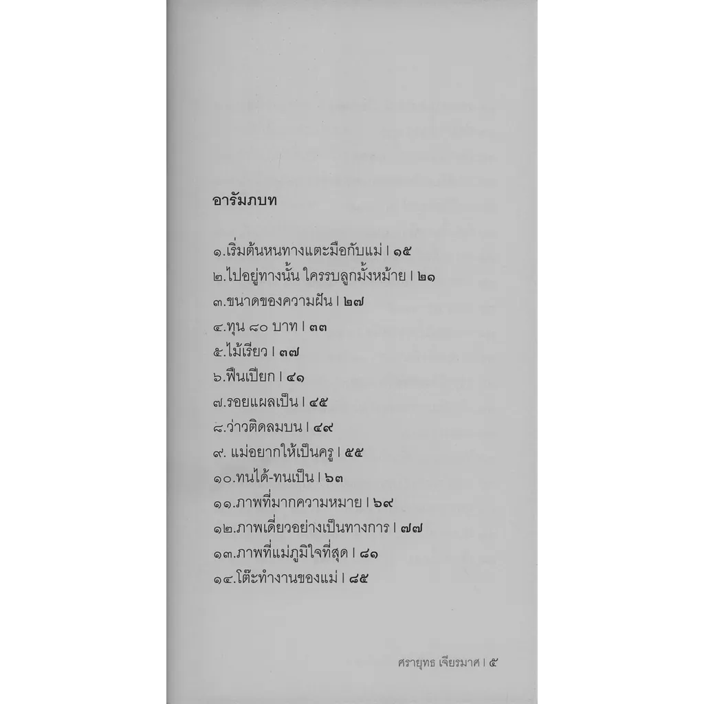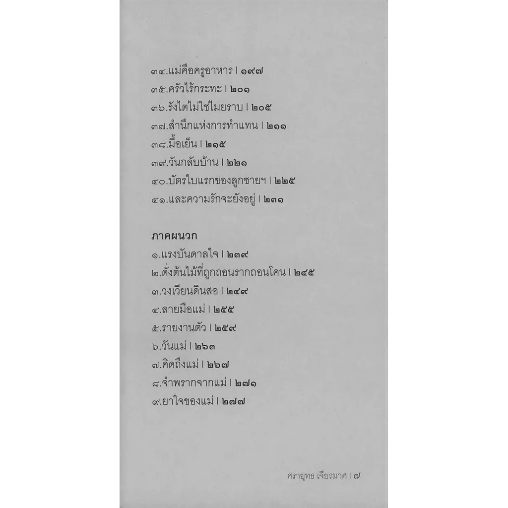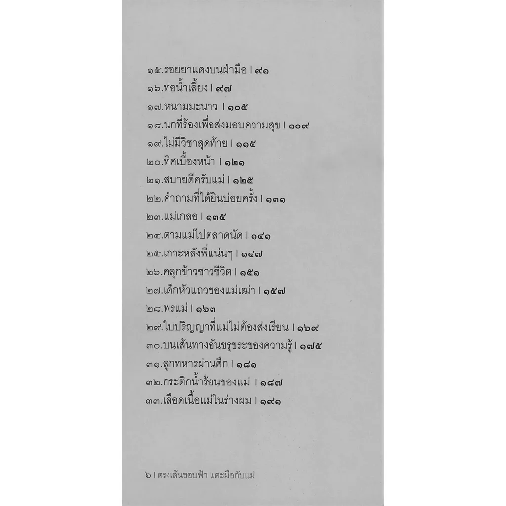 หนังสือเล่มนี้ บรรจุความรักของแม่ไว้ 41 บท แม้ตรงนี้ไม่มีแม่แล้วแต่ตรงโน้นความรักของแม่ยังสดใสเสมอ ‘ตรงเส้นขอบฟ้าแตะมือกับแม่’ ผมกำลังวาดภาพความทรงจำสีจางๆของตัวเองให้แจ่มชัดขึ้น เรื่องราวที่ถ่ายทอดไม่ใช่สนทนากับคนอื่น แต่คือการสนทนากับตัวเอง