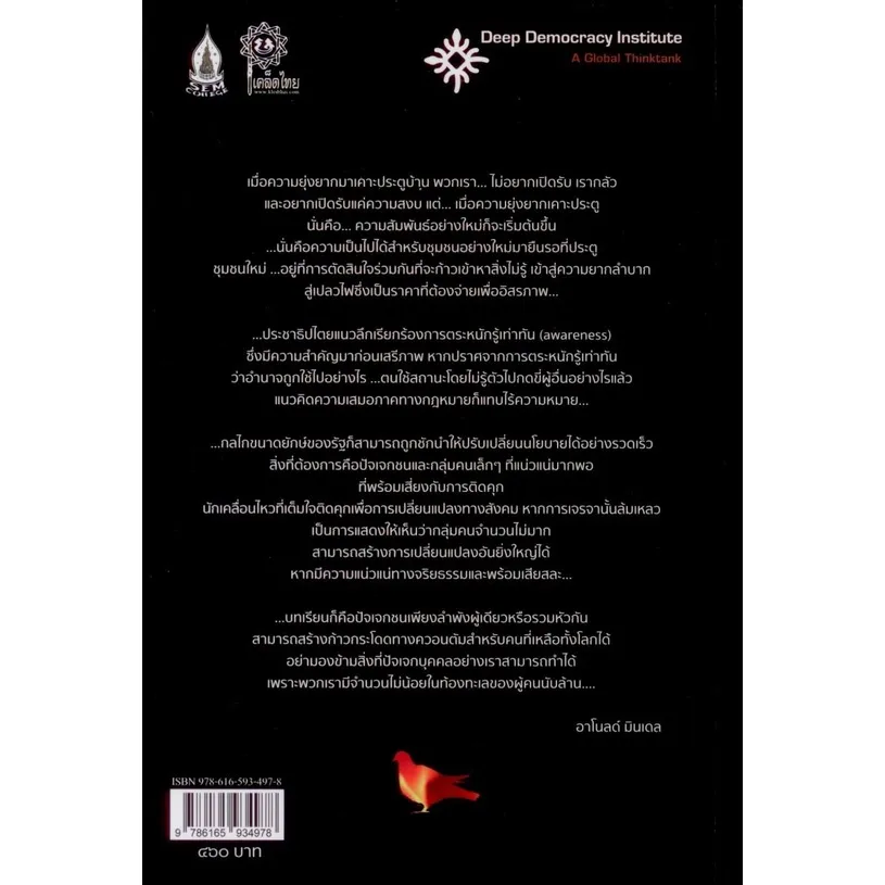 “ผู้เขียนกล้าหาญทางสติปัญญา อย่างยากจะหานักคิดร่วมสมัยทาบได้ เขาพยายามผสมผสานภูมิปัญญาหลายสายเข้ามาเพื่อทำงานกับความขัดแย้งในสังคมมนุษย์ ทั้งควอนตั้งฟิสิคส์ จิตวิทยาสายคาล จุง เต๋า เซน รวมทั้งวิชาพ่อมดหมอผีจากอัฟริกาและชนพื้นเมืองต่างๆ ที่สำคัญมากก็คือการเจริญสติ และปัญญา เพื่อนำการตื่นรู้ เข้ามาสู่ปฏิบัติการทางการเมือง