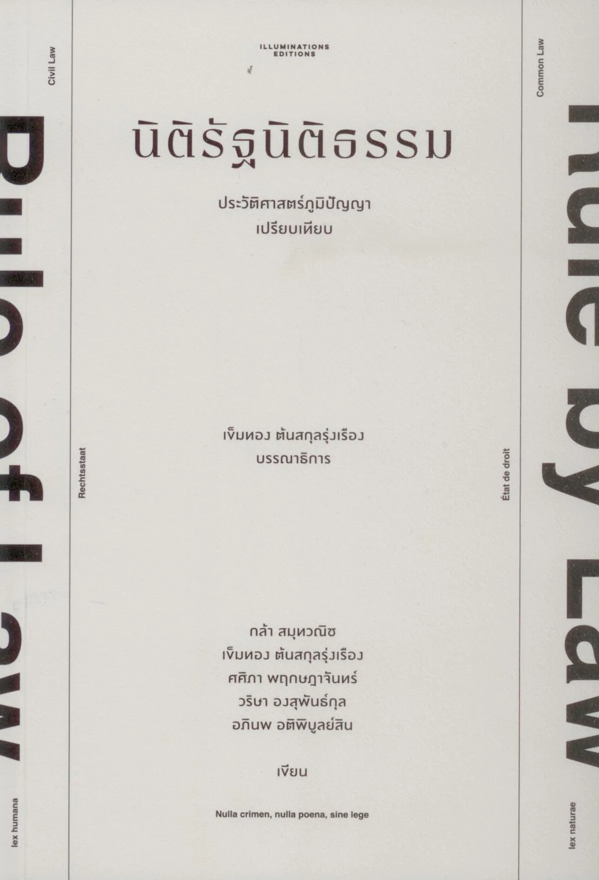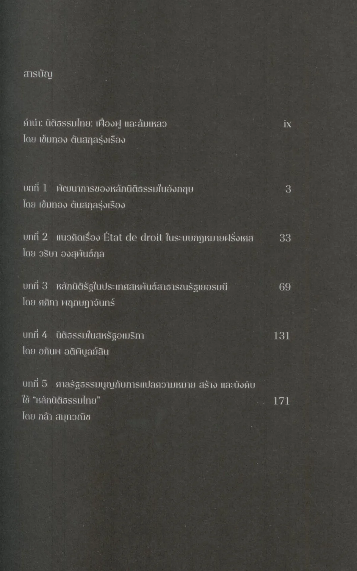 หนังสือรวมบทความจาก 5 นักวิชาการรุ่นใหม่ เข็มทอง ต้นสกุลรุ่งเรือง, วริษา องสุพันธ์กุล, ศศิภา พฤกษฎาจันทร์, อภินพ อติพิบูลย์สิน และกล้า สมุทวณิช ผู้ศึกษาในระบบกฎหมายที่ตนรับผิดชอบ ทั้งระบบจากสหราชอาณาจักร สหรัฐอเมริกา ฝรั่งเศส และเยอรมนี ซึ่งเป็นระบบกฎหมายหลักที่นักนิติศาสตร์ใช้อ้างอิงในฐานะตัวแบบอยู่เสมอ โดยผู้เขียนแต่ละคนได้สำรวจที่มาและความหมายของหลักนิติธรรมหรือหลักการชื่ออื่นที่มีเนื้อหาใกล้เคียงกัน ก่อนจะยกกรณีศึกษาจากคดีสำคัญในแต่ละเขตอำนาจมาเพื่อให้ผู้อ่านได้เข้าใจหลักการและแนวปฏิบัติเกี่ยวกับหลักนิติธรรมของนานาอารยประเทศ ปิดท้ายด้วยการสำรวจหลักนิติธรรมในไทยผ่านศาลรัฐธรรมนูญ