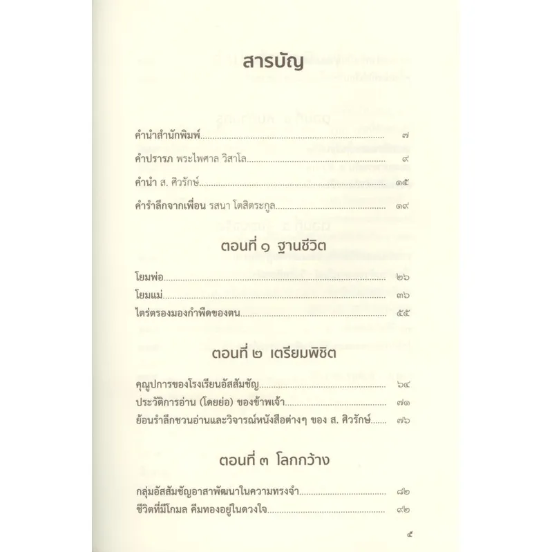 “…ว่าเฉพาะหนังสือเล่มนี้ แม้จะมีเนื้อหาเกี่ยวกับชีวิตและงานของข้าพเจ้าเป็นหลัก แต่จำนวนไม่น้อยเป็นข้อเขียนอันเนื่องด้วยผู้อื่น ซึ่งมีบทบาทสำคัญต่อชีวิตของข้าพเจ้า จึงมีเรื่องราวของข้าพเจ้าไปเกี่ยวข้องด้วย หาไม่ก็เป็นบทความที่ถูกขอให้เขียนตามโอกาสต่างๆ ข้อเขียนส่วนใหญ่มีจุดมุ่งหมายเฉพาะกิจ และจบสิ้นในตัว แต่ก็มีบางบทที่ถูกพิมพ์ซ้ำ”