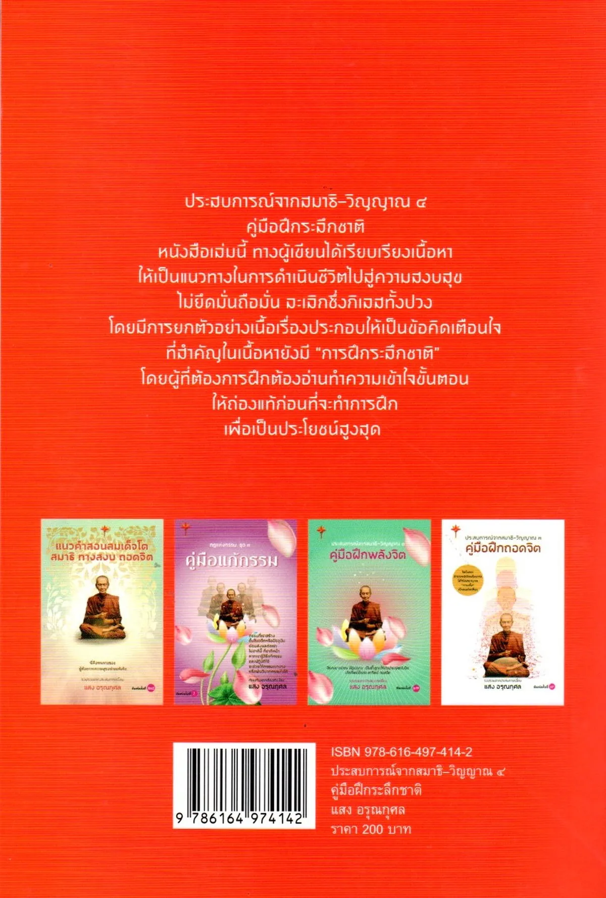 ประสบการณ์จากสมาธิ-วิญญาณ ๔ คู่มือฝึกระลึกชาติ หนังสือเล่มนี้ ทางผู้เขียนได้เรียบเรียงเนื้อหาให้เป็นแนวทางในการดำเนินชีวิตไปสู่ความสงบสุขไม่ยึดมั่นถือมั่น ละเลิกซึ่งกิเลสทั้งปวง โดยมีการยกตัวอย่างเนื้อเรื่องประกอบให้เป็นข้อคิดเตือนใจที่สำคัญในเนื้อหายังมี “การฝึกระลึกชาติ” โดยผู้ที่ต้องการฝึกต้องอ่านทำความเข้าใจขั้นตอนให้ถ่องแท้ก่อนที่จะทำการฝึกเพื่อเป็นประโยชน์สูงสุด.