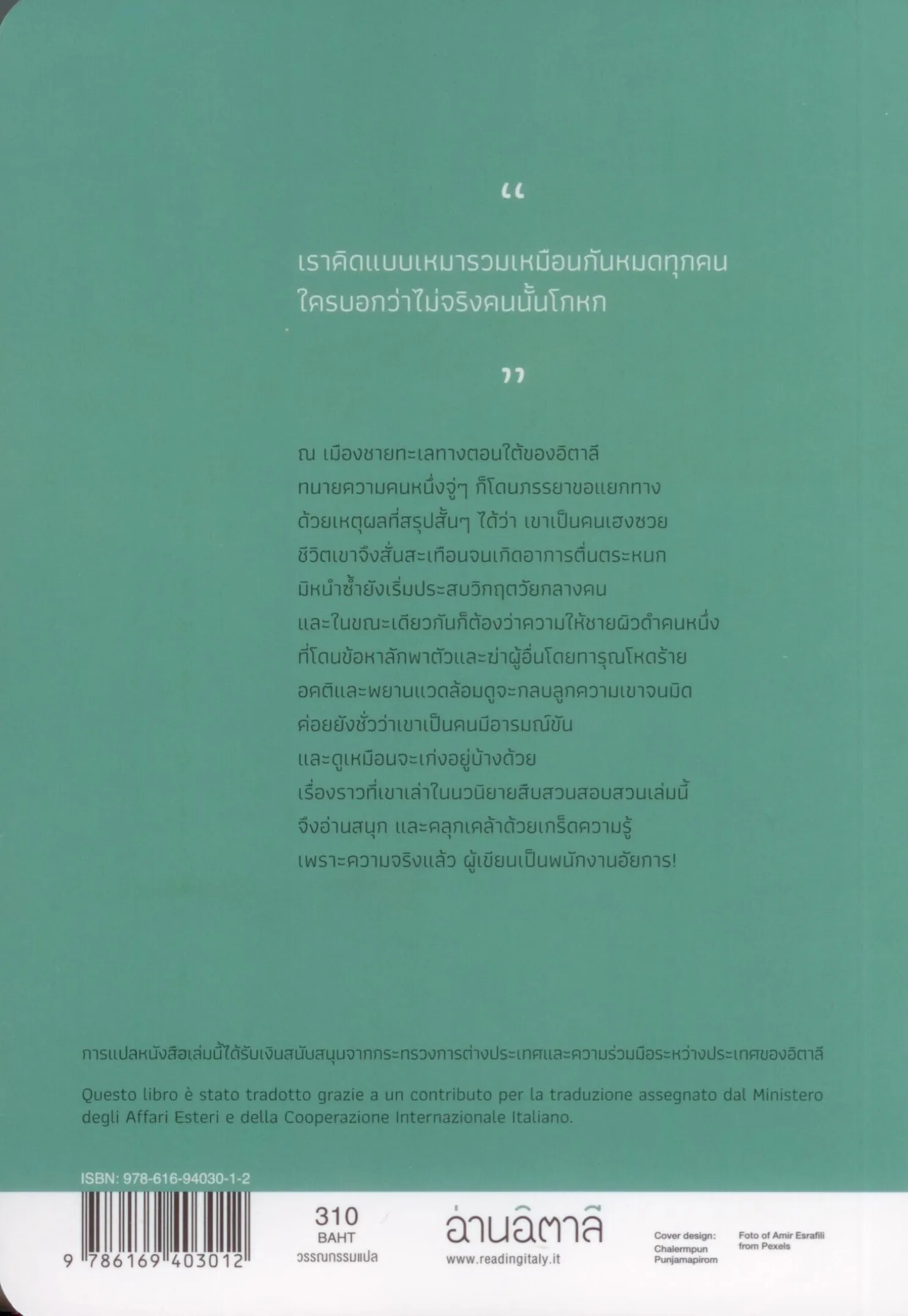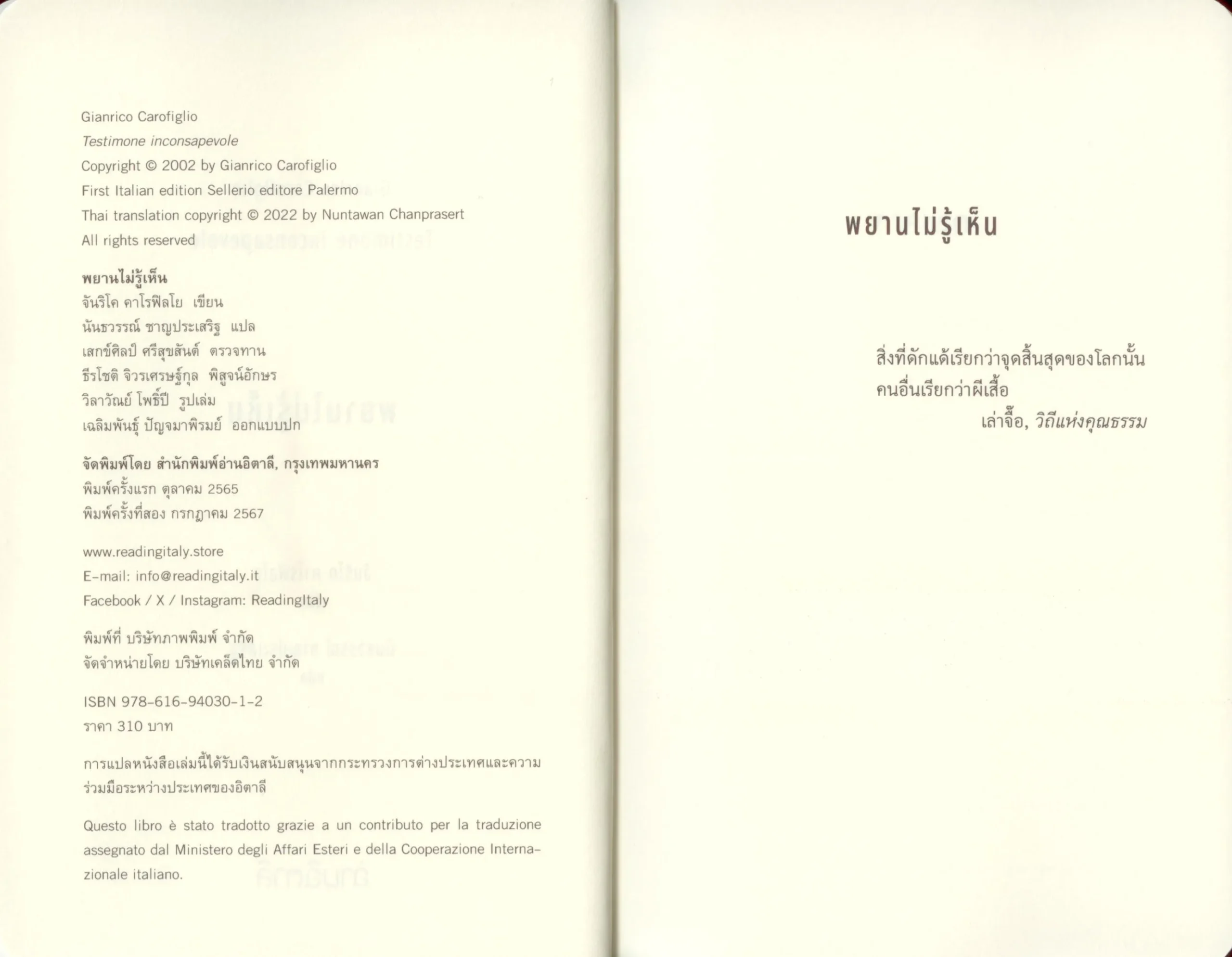 หนังสือเล่มนี้ได้รับเงินสนับสนุนการแปลจากกระทรวงการต่างประเทศและความร่วมมือระหว่างประเทศของอิตาลี Questo libro è stato tradotto grazie a un contributo per la traduzione assegnato dal Ministero degli Affari Esteri e della Cooperazione Internazionale Italiano.