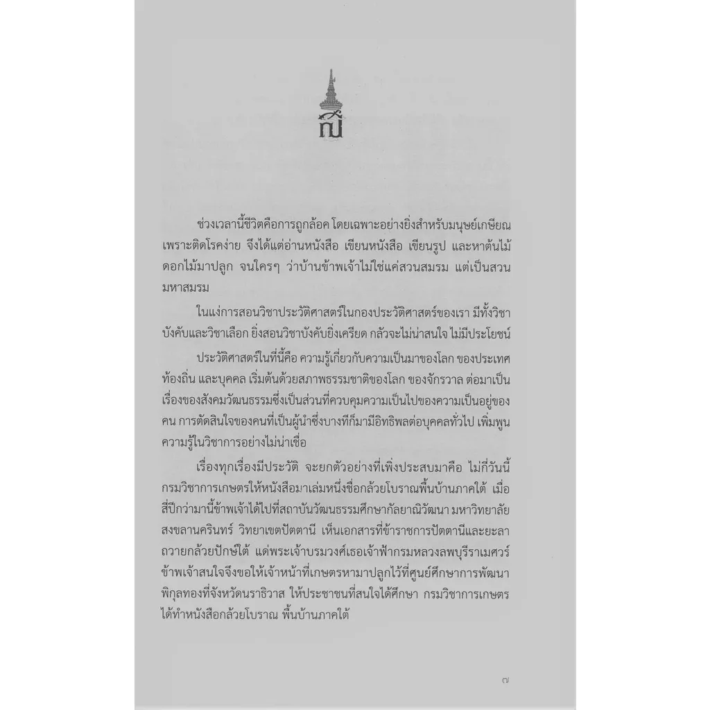 ช่วงเวลานี้ชีวิตคือการถูกล็อค โดยเฉพาะอย่างยิ่งสำหรับมนุษย์เกษียณ เพราะติดโรคง่าย จึงได้แต่อ่านหนังสือ เขียนหนังสือ เขียนรูป และหาต้นไม้ดอกไม้มาปลูก จนใครๆว่าบ้านข้าพเจ้าไม่ใช่แค่สวนสมรม แต่เป็นสวมมหาสมรม ในแง่การสอนวิชาประวัติศาสตร์ในกองประวัติศาสตร์ของเรา มีทั้งวิชาบังคับและวิชาเลือก ยิ่งสอนวิชาบังคับยิ่งเครียด กลัวจะไม่น่าสนใจ ไม่มีประโยชน์ ประวัติศาสตร์ในที่นี้คือ ความรู้เกี่ยวกับความเป็นมาของโลก ของประเทศ ท้องถิ่น และบุคคล เริ่มต้นด้วยสภาพธรรมชาติของโลก ของจักรวาล ต่อมาเป็นเรื่องของสังคมวัฒนธรรมซึ่งเป็นส่วนที่ควบคุมความเป็นไปของความเป็นอยู่ของคน การตัดสินใจของคนที่เป็นผู้นำ ซึ่งบางทีก็มามีอิทธิพลต่อบุคคลทั่วไป เพิ่มพูนความรู้ในวิชาการอย่างไม่น่าเชื่อ เรื่องทุกเรื่องมีประวัติ จะยกตัวอย่างที่เพิ่งประสบมาคือ ไม่กี่วันนี้กรมวิชาการเกษตรให้หนังสือมาเล่มหนึ่งชื่อกล้วยโบราณพื้นบ้านภาคใต้ เมื่อสี่ปีกว่ามานี้ข้าพเจ้าได้ไปที่สถาบันวัฒนธรรมศึกษากัลยาณิวัฒนา มหาวิทยาลัยสงขลานครินทร์ วิทยาเขตปัตตานี เห็นเอกสารที่ข้าราชการปัตตานีและยะลาถวายกล้วยปักษ์ใต้ แด่พระเจ้าบรมวงศ์เธอเจ้าฟ้ากรมหลวงลพบุรีราเมศวร์ ข้าพเจ้าสนใจจึงขอให้เจ้าหน้าที่เกษตรหามาปลูกไว้ที่ศูนย์ศึกษาการพัฒนาพิกุลทอง ที่จังหวัดนาราธิวาส ให้ประชาชนที่สนใจได้ศึกษา กรมวิชาการเกษตรได้ทำหนังสือกล้วยโบราณ พื้นบ้านภาคใต้