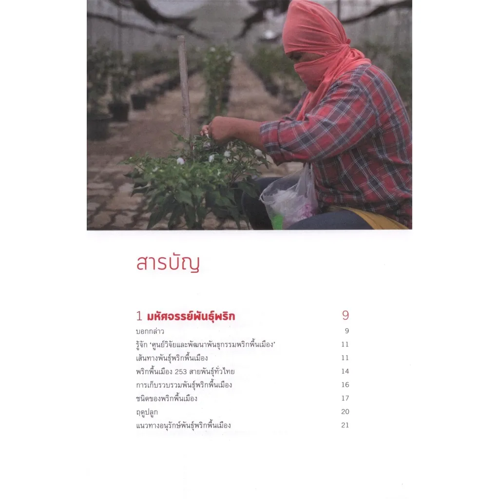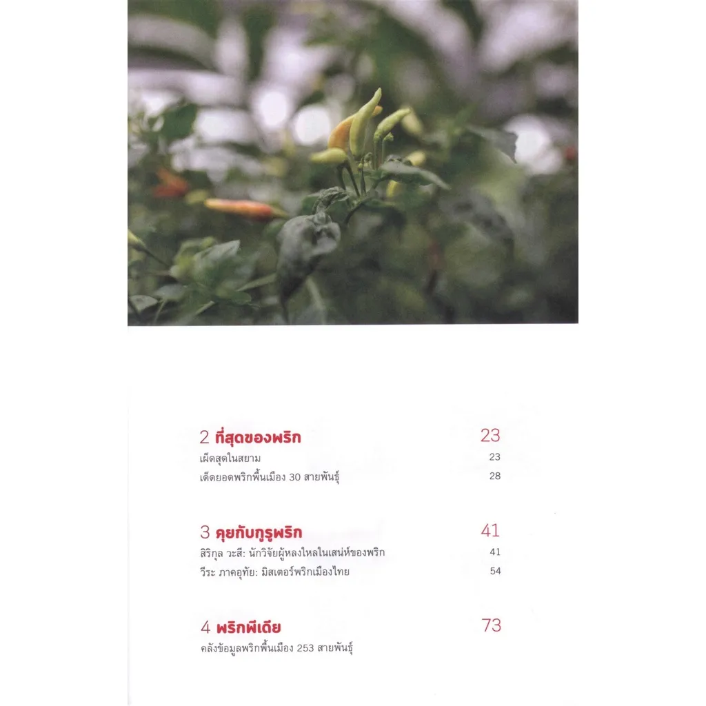 หนังสือเล่มนี้นำเสนอเรื่องราวความสำคัญของพริกพื้นเมือง ลักษณะดีเด่นของแต่ละสายพันธุ์ ผ่านการสำรวจและรวบรวมพันธุ์พริกพื้นเมืองทั้งสิ้น 253 สายพันธุ์ จากพื้นที่ 48 จังหวัด ทั้งในภาคเหนือ ภาคกลาง ภาคตะวันออกฉียงเหนือ ภาคตะวันออก ภาคตะวันตก และภาคใต้ พร้อมทั้งบมสัมภาษณ์สองนักวิจัยผู้เชี่ยวชาญเรื่องพริกเมืองไทย ได้แก่ ดร.สิริกุล วะสี และ อาจารย์วีระ ภาคอุทัย เพื่อให้ผู้อ่านได้ทำความรู้จักกับพริกในทุกแง่มุม