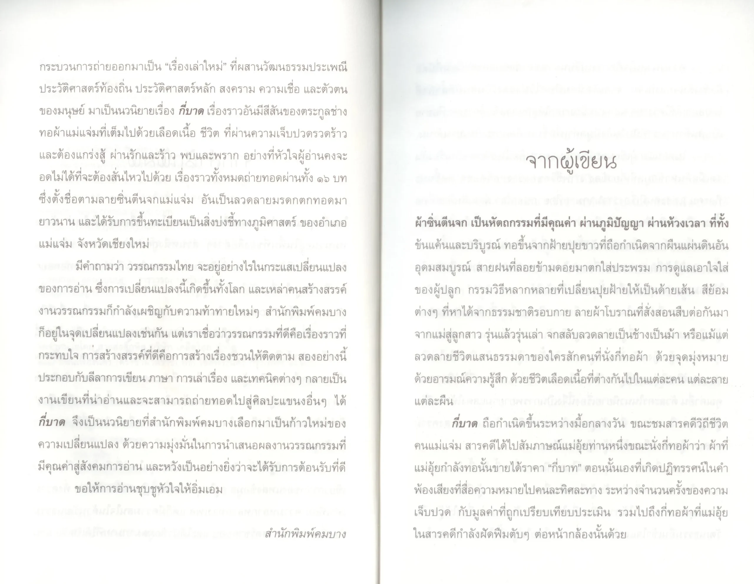ด้านศิลปะการประพันธ์ กี่บาด มีทั้งขนบวรรณศิลป์แบบดั้งเดิมประสานกับการสร้างสรรค์ใหม่ โดยใช้ศิลปะการทอผ้าและลวดลาย สื่อความหมายและดำเนินเรื่องอย่างมีเชิงชั้น เต็มไปด้วยสีสันท้องถิ่น นำพาผู้อ่านสู่อารมณ์สะเทือนใจ เห็นอกเห็นใจในชะตากรรมของมนุษย์ แม้จะต้องเผชิญประสบการณ์หรือความทรงจำอันปวดร้าวเพียงไร ชีวิตก็ต้องเดินไปข้างหน้า และถักทอเรื่องราวอันเป็นวัฒนธรรมเรื่องเล่าของมนุษยชาติต่อไป