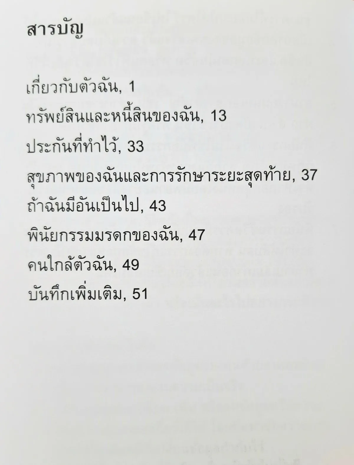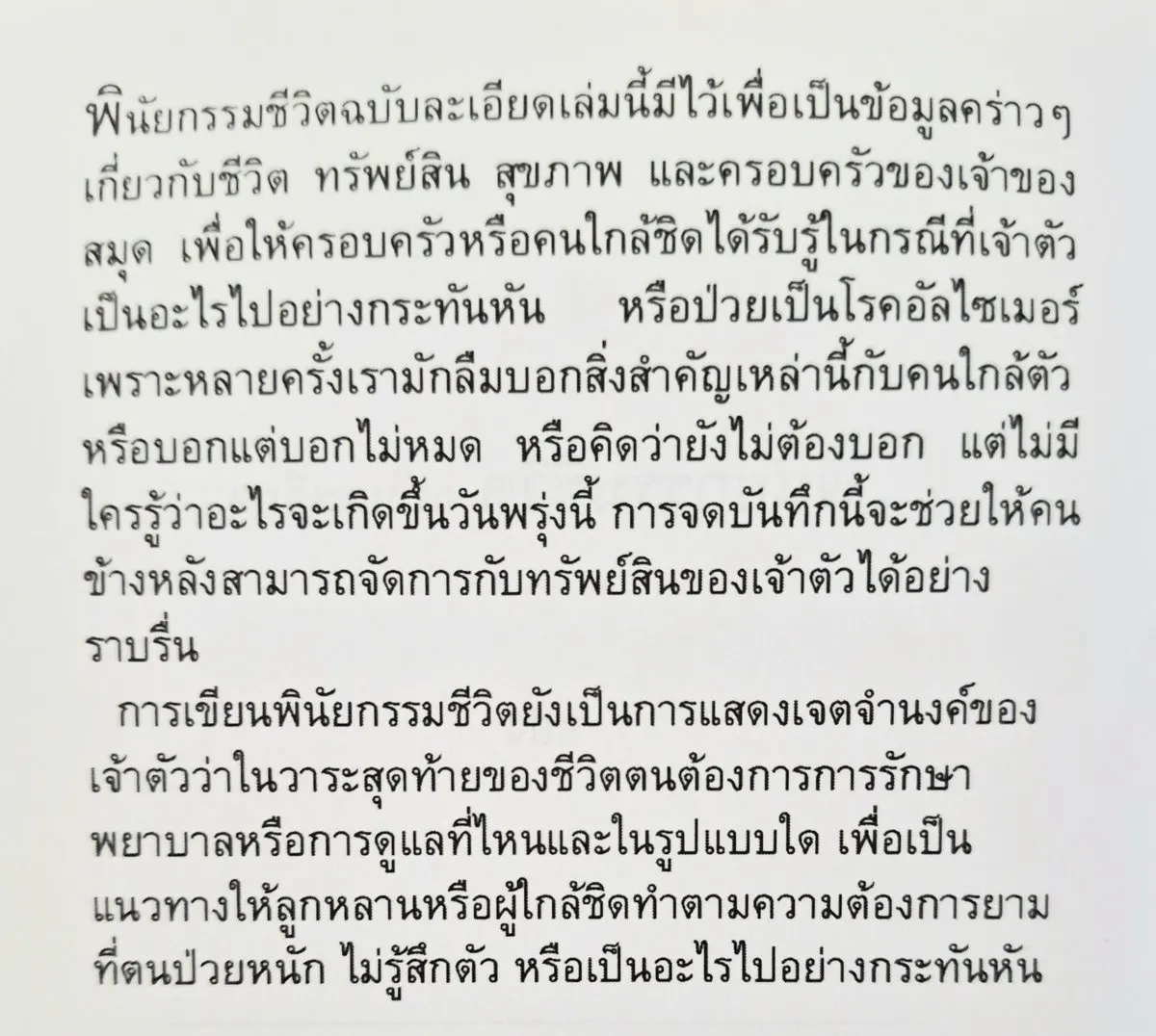 พินัยกรรมชีวิตฉบับละเอียดเล่มนี้มีไว้เพื่อเป็นข้อมูลคร่าวๆ เกี่ยวกับชีวิต ทรัพย์สิน สุขภาพ และครอบครัวของเจ้าของสมุด เพื่อให้ครอบครัวหรือคนใกล้ชิดได้รับรู้ในกรณีที่เจ้าตัวเป็นอะไรไปอย่างกระทันหัน หรือป่วยเป็นโรคอัลไซเมอร์ เพราะหลายครั้งเรามักลืมบอกสิ่งสำคัญเหล่านี้กับคนใกล้ตัว หรือบอกแต่บอกไม่หมด หรือคิดว่ายังไม่ต้องบอก แต่ไม่มีใครรู้ว่าอะไรจะเกิดขึ้นวันพรุ่งนี้ การจดบันทึกนี้จะช่วยให้คนข้างหลังสามารถจัดการกับทรัพย์สินของเจ้าตัวได้อย่างราบรื่น
