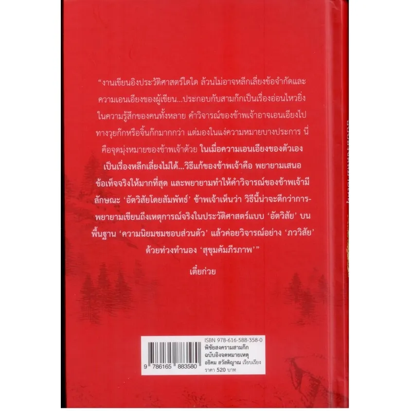 งานเขียนอิงประวัติศาสตร์ใดใด ล้วนไม่อาจหลีกเลี่ยงข้อจำกัดและความเอนเอียงของผู้เขียน…ประกอบกับสามก๊กเป็นเรื่องอ่อนไหวยิ่ง ในความรู้สึกของคนทั้งหลาย คำวิจารณ์ของข้าพเจ้าอาจเอนเอียงไปทางวุยก๊กหรือก๊กมากกว่า แต่มองในแง่ความหมายบางประการนี่ คือจุดมุ่งหมายของข้าพเจ้าด้วย ในเมื่อความเอนเอียงของตัวเอง เป็นเรื่องหลีกเลี่ยงไม่ได้…วิธีแก้ของข้าพเจ้าคือ พยายามเสนอ ข้อเท็จจริงให้มากที่สุด และพยายามทำให้คำวิจารณ์ของข้าพเจ้ามี ลักษณะ ”อัตวิสัยโดยสัมพันธ์” ข้าพเจ้าเห็นว่า วิธีนี้น่าจะดีกว่าการพยายามเขียนถึงเหตุการณ์จริงในประวัติศาสตร์แบบ ”อัตวิสัย” บนพื้นฐาน ”ความนิยมชมชอบส่วนตัว” แล้วค่อยวิจารณ์อย่าง ”ภววิสัย” ด้วยท่วงทำนอง ”สุขุมคัมภีรภาพ”
