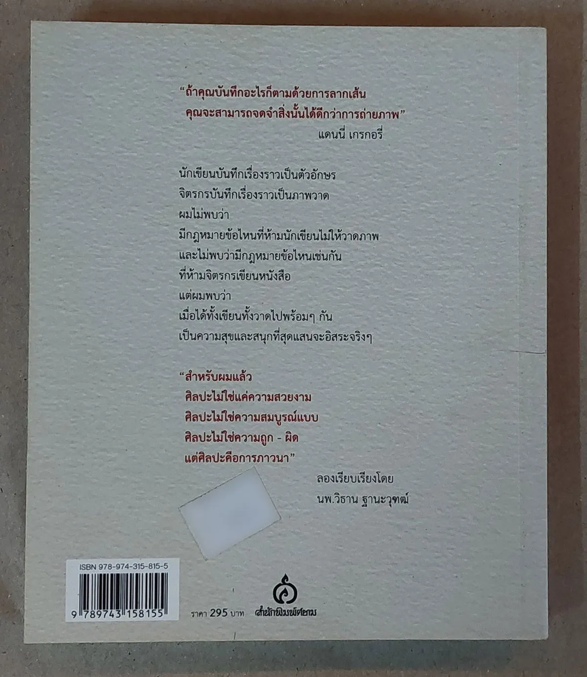 นักเขียนบันทึกเรื่องราวเป็นตัวอักษรจิตรกรบันทึกเรื่องราวเป็นภาพวาดผมไม่พบว่ามีกฎหมายข้อไหนที่ห้ามนักเขียนไม่ให้วาดภาพและไม่พบว่ามีกฎหมายข้อไหนเช่นกันที่ห้ามจิตรกรเขียนหนังสือแต่ผมพบว่าเมื่อได้ทั้งเขียนทั้งวาดไปพร้อมๆ กันเป็นความสุขและสนุกที่สุดแสนจะอิสระจริงๆ….ฯลฯ
