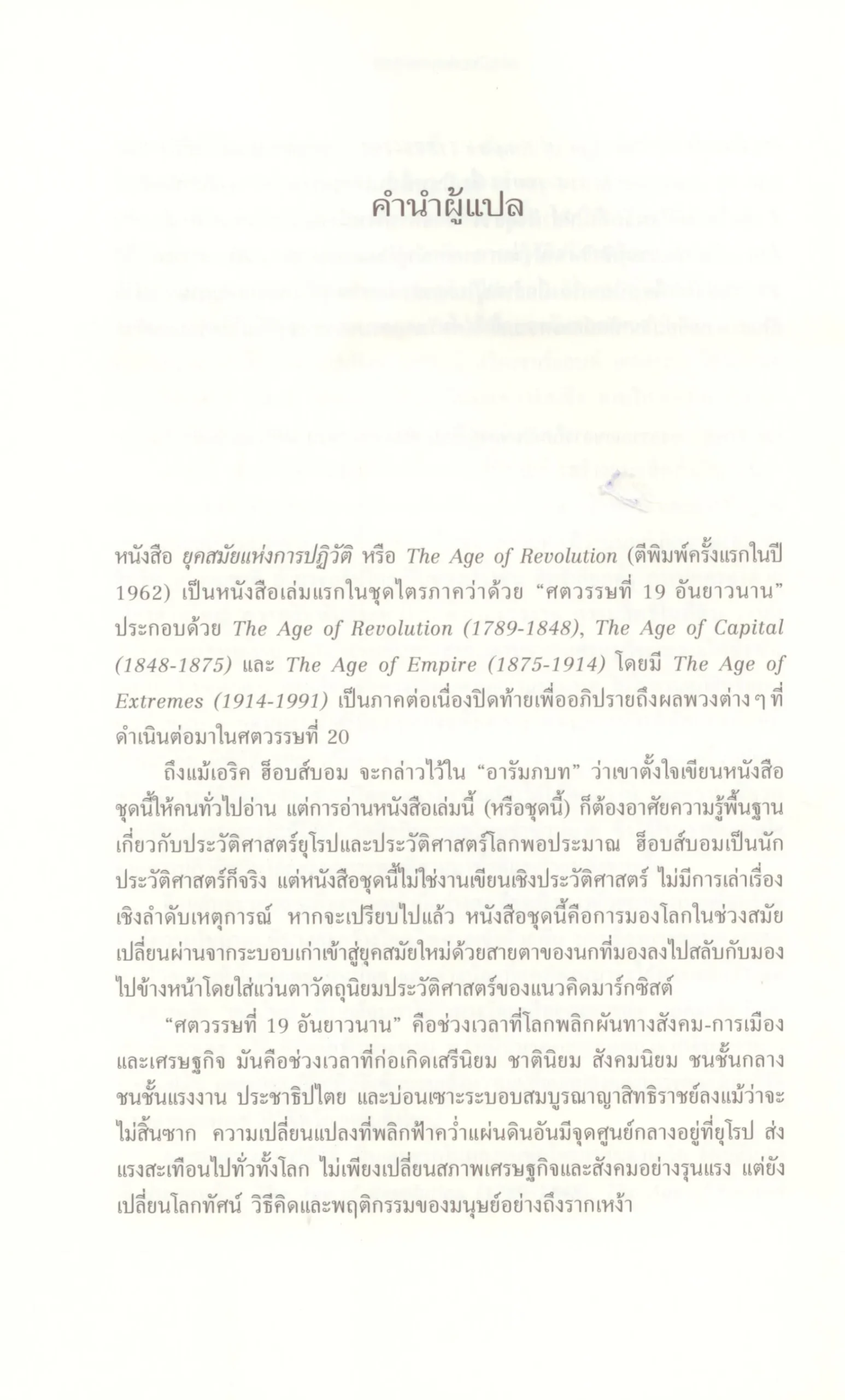 “ศตวรรษที่ 19 อันยาวนาน” คือช่วงเวลาที่โลกพลิกผันทางสังคม-การเมืองและเศรษฐกิจ มันคือช่วงเวลาที่ก่อเกิดเสรีนิยม ชาตินิยม สังคมนิยม ชนชั้นกลาง ชนชั้นแรงงาน ประชาธิปไตย และบ่อนเซาะระบอบสมบูรณาญาสิทธิราชย์ลงแม้ว่าจะไม่สิ้นซาก ความเปลี่ยนแปลงที่พลิกฟ้าคว่ำแผ่นดินอันมีจุดศูนย์กลางอยู่ที่ยุโรป ส่งแรงสะเทือนไปทั่วทั้งโลก ไม่เพียงเปลี่ยนสภาพเศรษฐกิจและสังคมอย่างรุนแรง แต่ยังเปลี่ยนโลกทัศน์ วิธีคิดและพฤติกรรมของมนุษย์อย่างถึงรากเหง้า