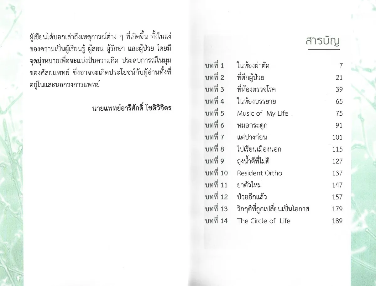 ผู้เขียนได้บอกเล่าถึงเหตุการณ์ต่าง ๆ ที่เกิดขึ้น ทั้งในแง่ของความเป็นผู้เรียนรู้ ผู้สอน ผู้รักษา และผู้ป่วย โดยมีจุดมุ่งหมายเพื่อจะแบ่งปันความคิด ประสบการณ์ในมุมของศัลยแพทย์ ซึ่งอาจจะเกิดประโยชน์กับผู้อ่านทั้งที่อยู่ในและนอกวงการแพทย์