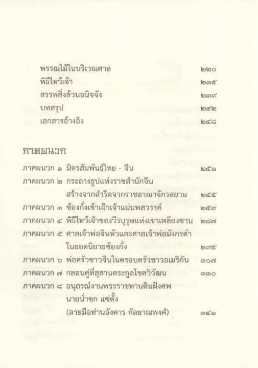 หนังสือเล่าถึงศาลเจ้าวังต้น โดยโยงใยไปถึงเรื่องอื่นๆ ทางจีนวิทยาอย่างกว้างขาง ทั้งน่ารู้และสนุก ผู้เขียนพยายามที่จะปูพื้นเรื่องความเชื่อของคนจีนทั้งในเรื่องศาสนาและลัทธิความเชื่อต่างๆ รวมทั้งถ้อยคำภาษาจีน และสัญลักษณ์ต่างๆ ตลอดจนไม้ยืนต้นที่ปลูกไว้โดยรอบ พิธีไหว้เจ้าโดยสังเขป เพื่อให้คนรุ่นปัจจุบันได้เข้าใจความสำคัญและความหมายต่างๆ ซึ่งน้อยคนจะรู้แล้ว