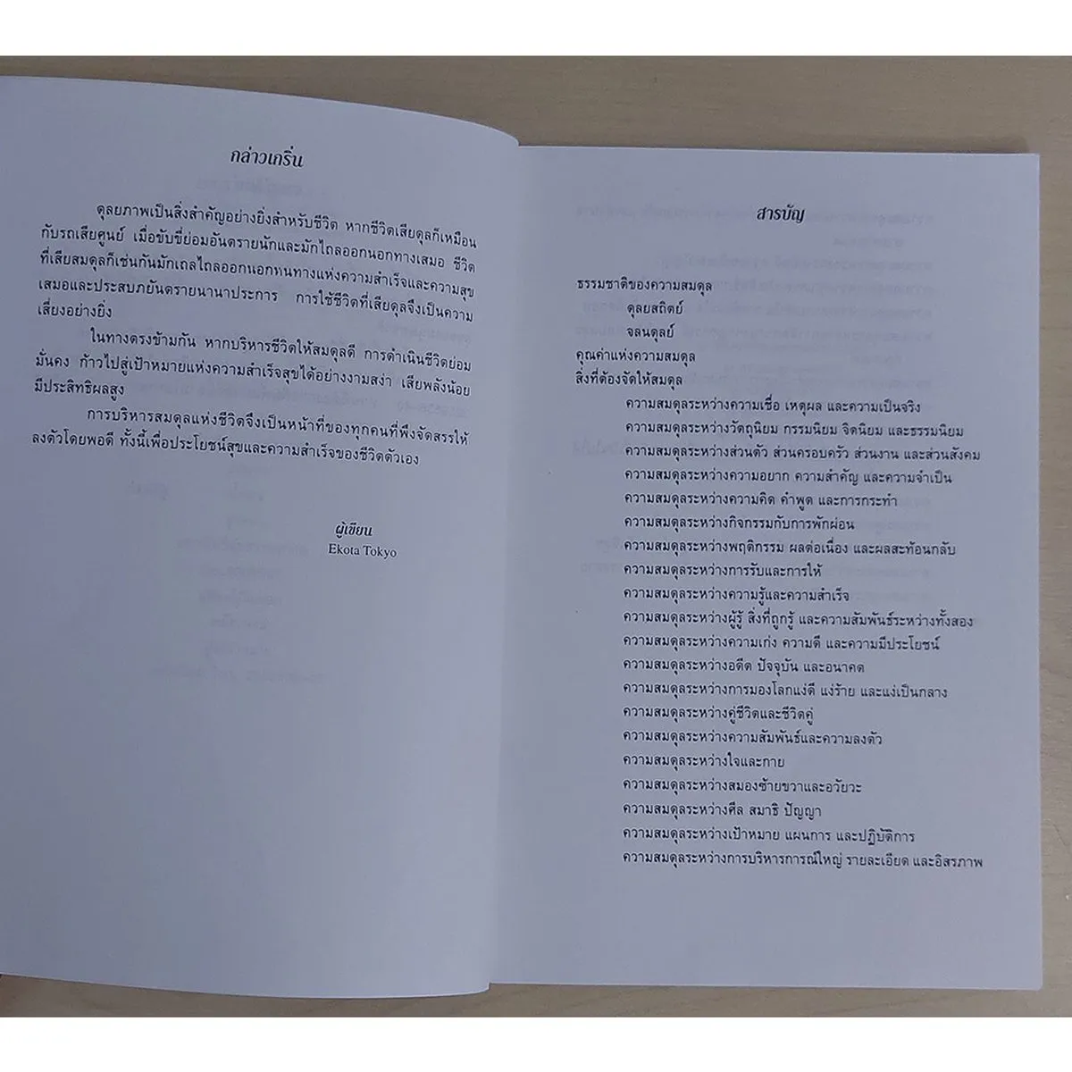 หนังสือเล่มนี้แนะแนวทางให้ท่านรู้จักใช้ชีวิตอย่างสมดุล เพราะดุลยภาพเป็นเรื่องสำคัญยิ่ง การดำเนินชีวิตไม่ว่าในครรลองใดๆก็ตาม ถ้าตั้งอยู่ในสมดุล รู้จักจัดสรรปันส่วนระหว่างสิ่งต่างๆให้มีความพอดี ไม่มีอะไรมากหรือน้อยจนเกินไป ชีวิตก็จะประสบความสุขและความสำเร็จโดยไม่ยาก ด้วยว่าทุกอย่างมีความลงตัวนั่นเอง