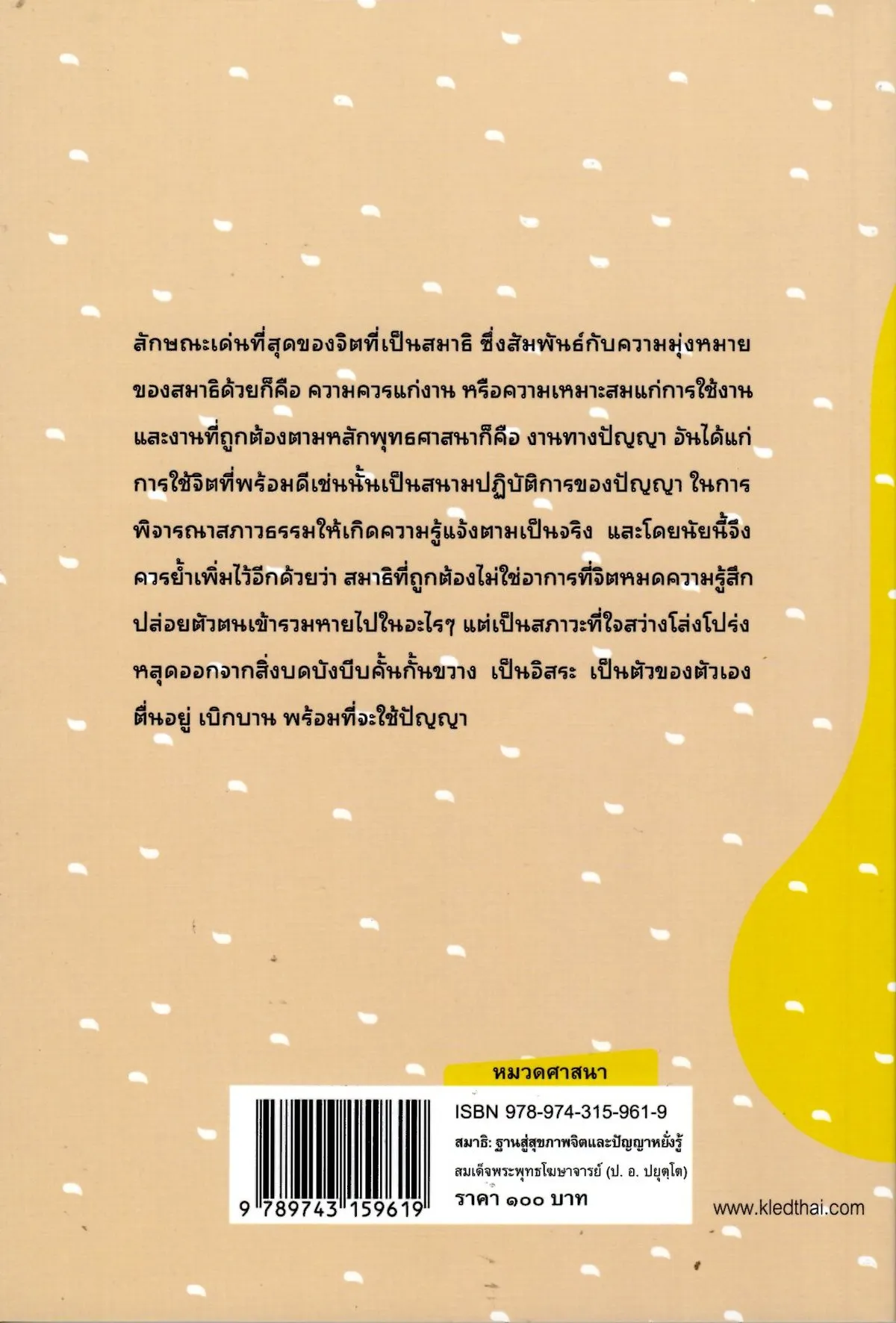สมาธิ : ฐานสู่สุขภาพจิตและปัญญาหยั่งรู้ เป็นหนังสือในหมวดศาสนาอีกเล่มหนึ่งที่เล่าหรืออธิบายโดยเน้นเรื่องของสมาธิอย่างละเอียดเพื่อให้ผู้อ่านสามารถเข้าใจได้ง่ายยิ่งขึ้น ซึ่งในเนื้อหาภายในเล่มจะประกอบไปด้วย ความหมายของคำว่าสมาธิ วิธีการเจริญสมาธิ และผลสูงสุดของสมาธิ จะเห็นว่าเป็นการเริ่มต้นจนไปถึงผลดีที่ผู้ปฏิบัติจะได้รับเมื่อมีการปฏิบัติที่สม่ำเสมอ ด้วยความตั้งใจ นอกจากนั้นก็จะมีผลดีและสิ่งดี ๆ ตามมา ไม่ว่าจะเป็นจิตใจที่ผ่องใส คิดในทางที่ดี จิตใจไม่ฟุ้งซ่านเมื่อกระทบต่อสิ่งเร้าภายนอก เพราะการเจริญสติที่ดีและถูกต้องควรเริ่มจากการมีจิตใจที่สะอาด สว่าง โล่งโปร่ง เรียกได้ว่า สติเป็นที่พึ่งทางใจนั่นเอง