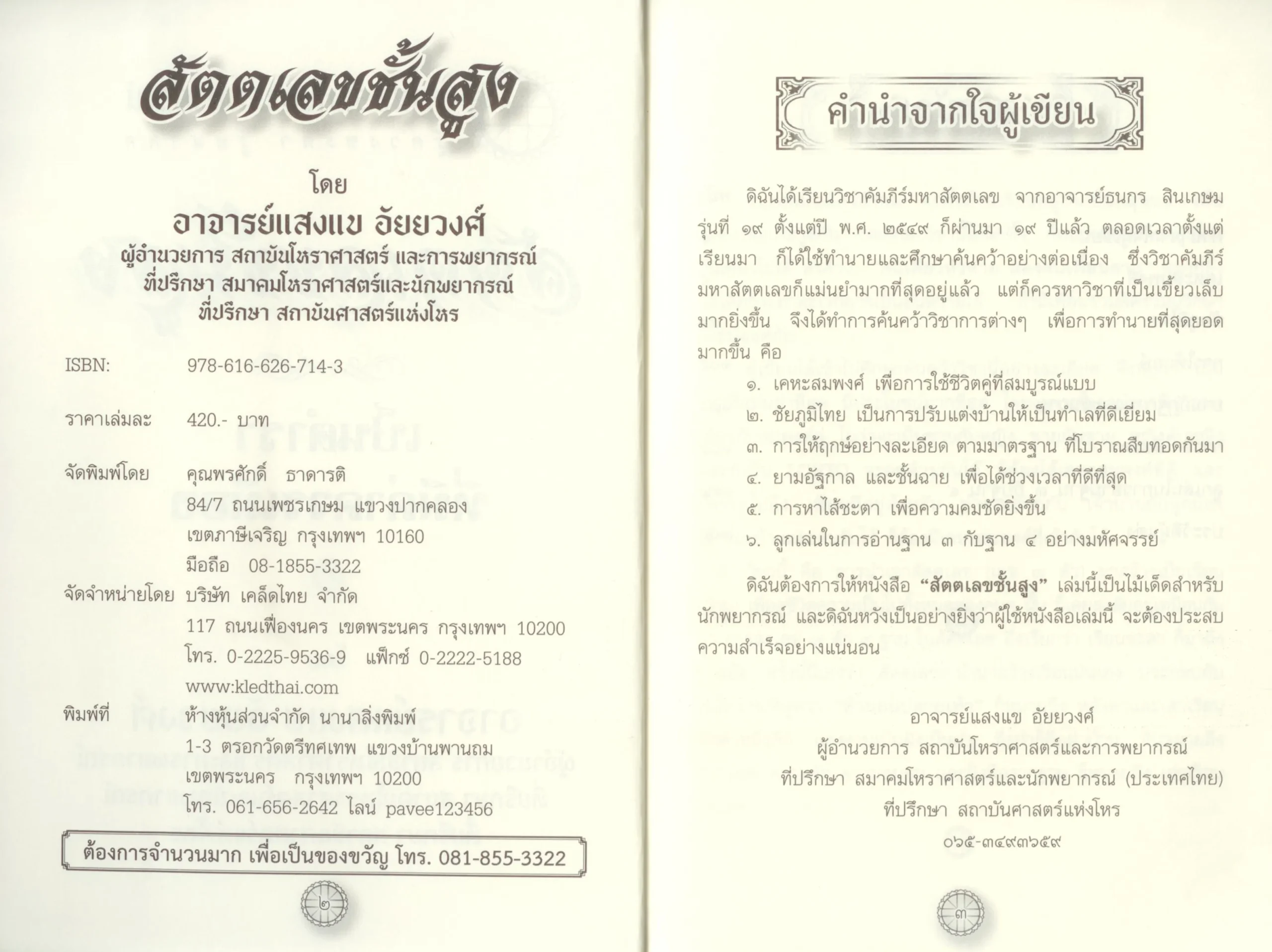 ดิฉันต้องการให้หนังสือ “สัตตเลขชั้นสูง” เล่มนี้เป็นไม้เด็ดสําหรับนักพยากรณ์ และดิฉันหวังเป็นอย่างยิ่งว่าผู้ใช้หนังสือเล่มนี้ จะต้องประสบความสําเร็จอย่างแน่นอน
