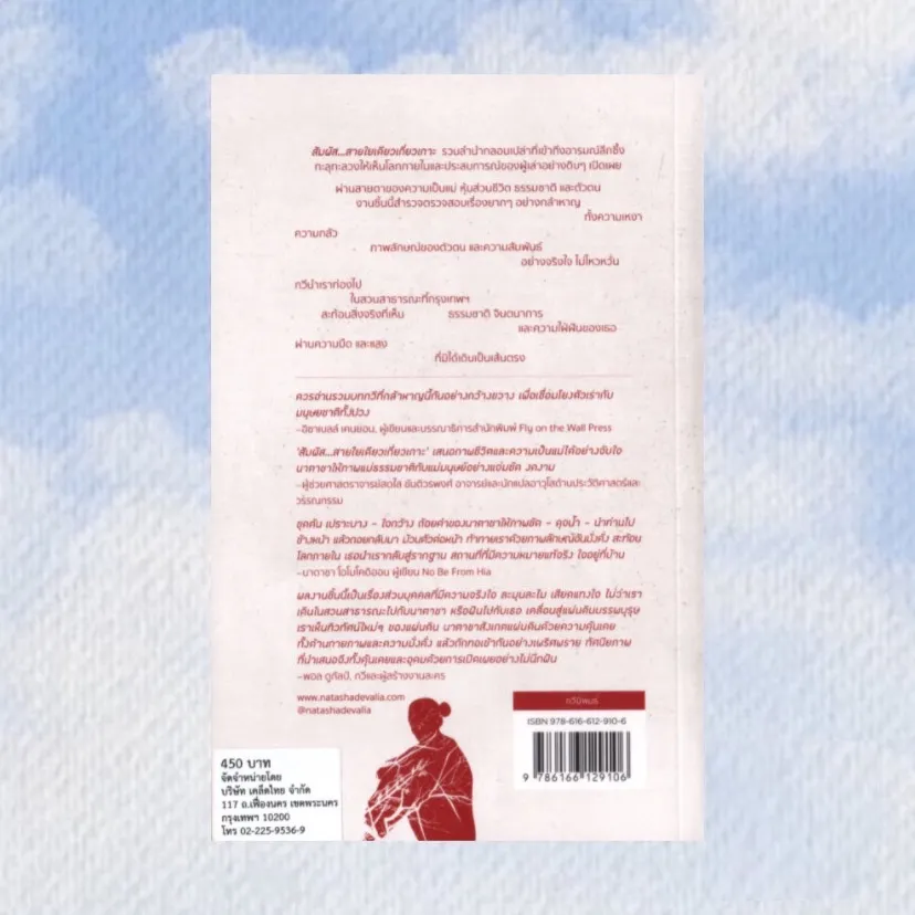 สัมผัส สายใยเดียวเที่ยวเกาะ รวมลำนำกลอนเปล่าที่เข้าถึงอารมณ์ลึกซึ่งทะลุทะลวงให้เห็นภายในและประสบการณ์ของผู้เล่าอย่างดิบๆ เปิดเผย ผ่านสายตาของความเป็นแม่ หุ้นส่วนชีวิต ธรรมชาติ และตัวตน งานชิ้นนี้สำรวจตรวจสอบเรื่องยากๆ อย่างกล้าหาญ ทั้งความเหงา ความกลัว ภาพลักษณ์ของตัวตนและความสัมพันธ์อย่างจริงใจ ไม่ไหวหวั่น กวีนำเราท่องไป ในสวนสาธารณะที่กรุงเทพฯ สะท้อนสิ่งที่จริงที่เห็น ธรรมชาติ จินตนาการ และความใฝ่มันของเธอ ผ่านความมืดและแสง ที่มิได้เดินเป็นเส้นตรง