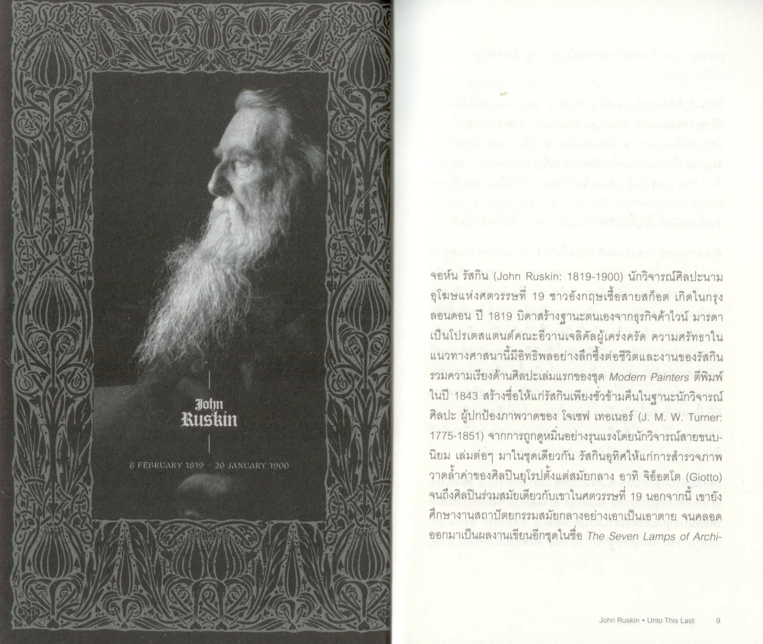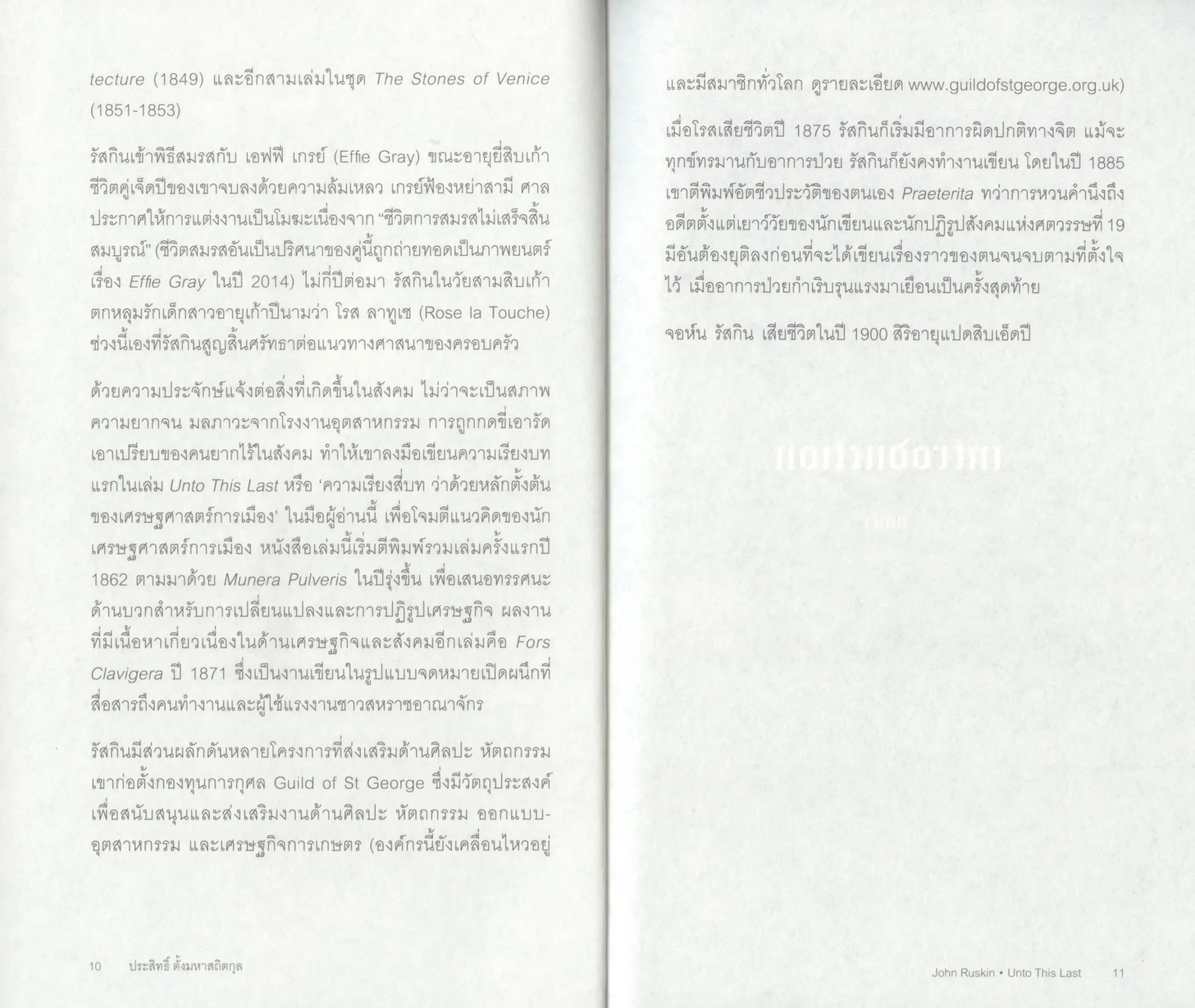 นำไปสู่การนิยามที่น่าสนใจของคำว่า ความมั่งคั่ง ความร่ำรวย ค่าจ้าง แรงงาน ลูกจ้าง มูลค่า ความยุติธรรม…ความคิดของรัสกินนี้สร้างแรงสั่นสะเทือนต่อความคิดเรื่องเศรษฐศาสตร์การเมืองในช่วงศตวรรษที่ 19 ถึงขนาดที่รัสกินถูกสั่งให้หยุดเขียนเรื่องนี้