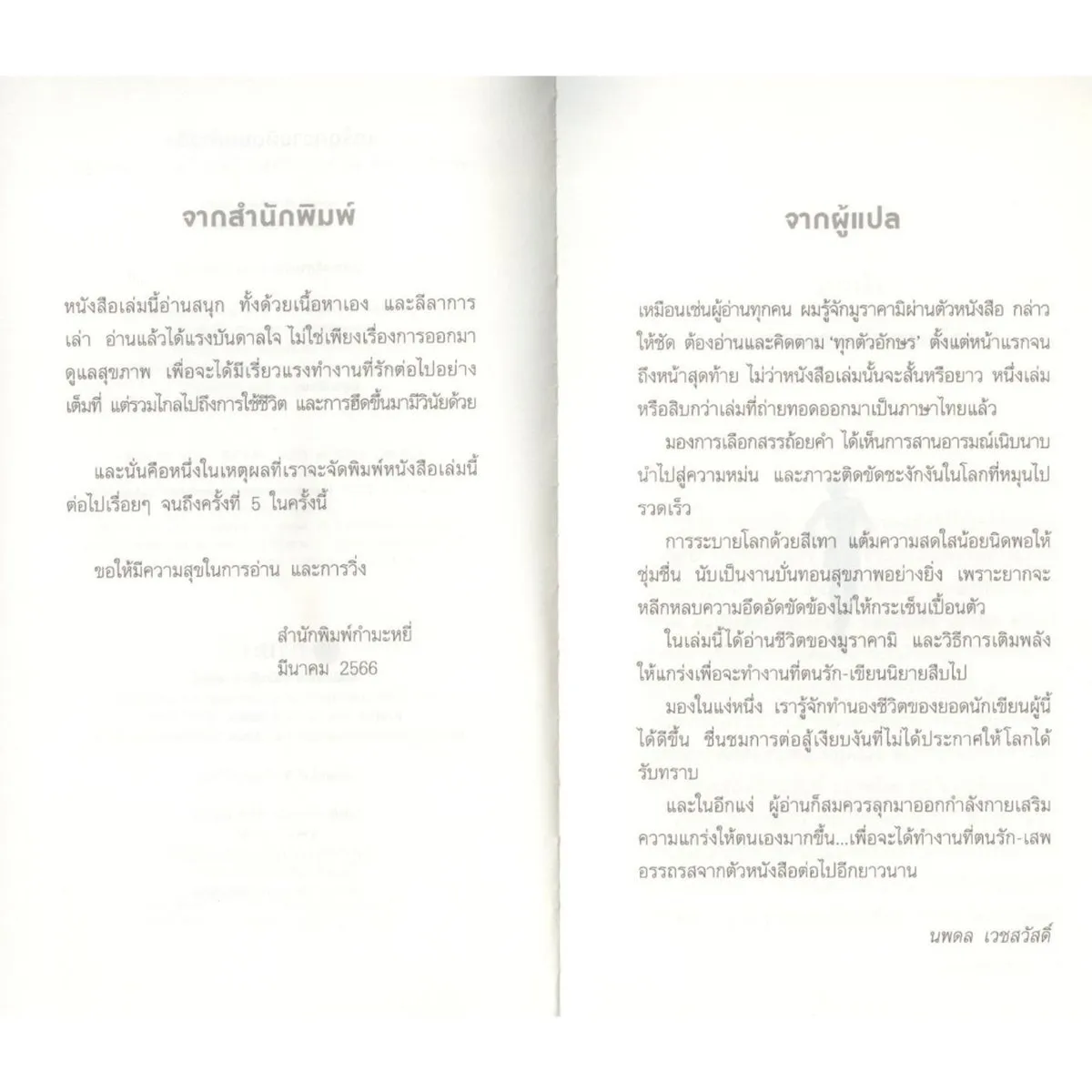 หนังสือเล่มนี้อ่านสนุก ทั้งด้วยเนื้อหาเอง และลีลาการเล่า อ่านแล้วได้แรงบันดาลใจ ไม่ใช่เพียงเรื่องการออกมาดูแลสุขภาพเพื่อจะได้มีเรี่ยวแรงทำงานที่รักต่อไปอย่างเต็มที่ แต่รวมไกลไปถึงการใช้ชีวิต และการฮึดขึ้นมามีวินัยด้วยและนั่นคือหนึ่งในเหตุผลที่เราจะจัดพิมพ์หนังสือเล่มนี้ต่อไปเรื่อยๆ จนถึงครั้งที่ 5 ในครั้งนี้