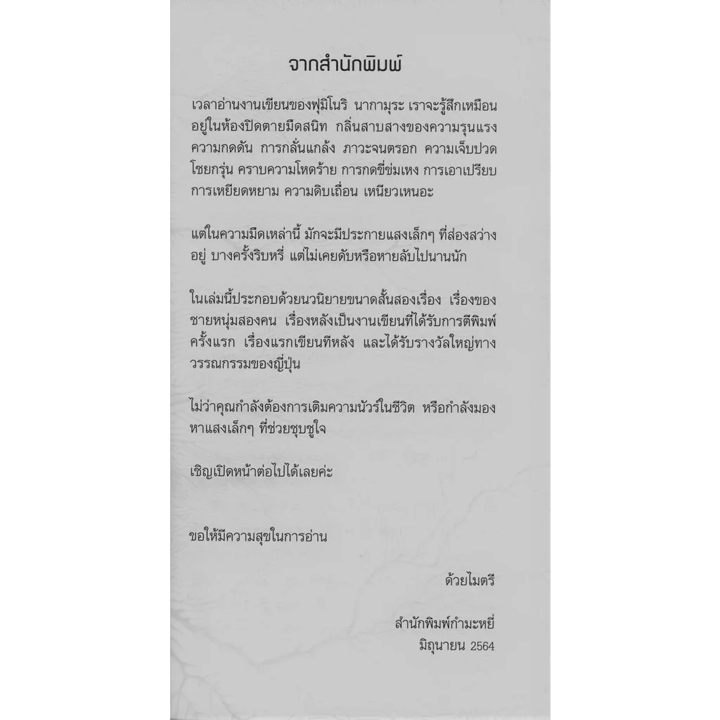 เวลาอ่านงานเขียนของฟูมิโนริ นากามูระ เราจะรู้สึกเหมือนอยู่ในห้องปิดตายมืดสนิท กลิ่นสาบสางของความรุนแรง ความกดดัน การกลั่นแกล้ง ภาวะจนตรอก ความเจ็บปวด โชยกรุ่น คราบความโหดร้าย การกดขี่ข่มเหง การเอาเปรียบ การเหยียดหยาม ความดิบเถื่อน เหนียวเหนอะ