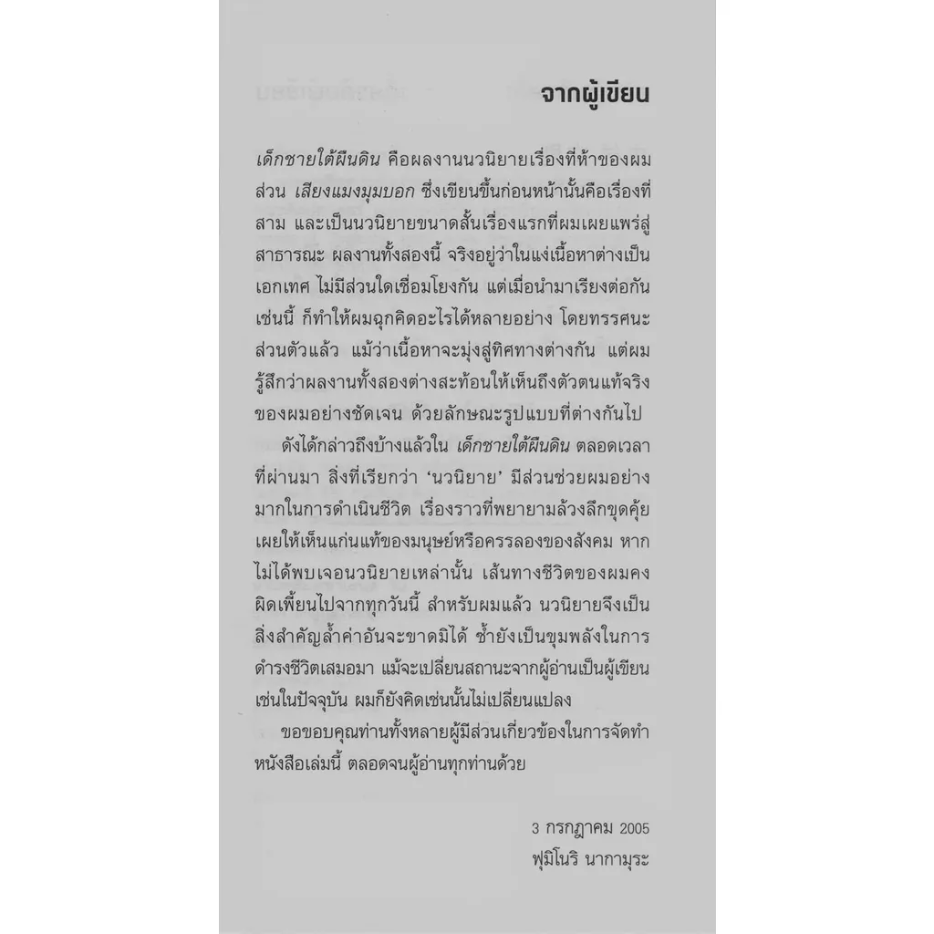 ‘เด็กชายใต้ผืนดิน’ คือผลงานนวนิยายเรื่องที่ห้าของผม ส่วน ‘เสียงแมงมุมบอก’ ซึ่งเขียนขึ้นก่อนหน้านั้นคือเรื่องที่สาม และเป็นนวนิยายขนาดสั้นเรื่องแรกที่ผมเผยแพร่สู่สาธารณะ ผลงานทั้งสองนี้ จริงอยู่ว่าในแง่เนื้อหาต่างเป็นเอกเทศ ไม่มีส่วนใดเชื่อมโยงกัน แต่เมื่อนำมาเรียงต่อกันเช่นนี้ ก็ทำให้ผมฉุกคิดอะไรได้หลายอย่าง โดยทรรศนะส่วนแล้ว แม้ว่าเนื้อหาจะมุ่งสู่ทิศทางต่างกัน แต่ผมรู้สึกว่าผลงานทั้งสองต่างสะท้อนให้เห็นถึงตัวตนแท้จริงของผมอย่างชัดเจน ด้วยลักษณะรูปแบบที่ต่างกันไป