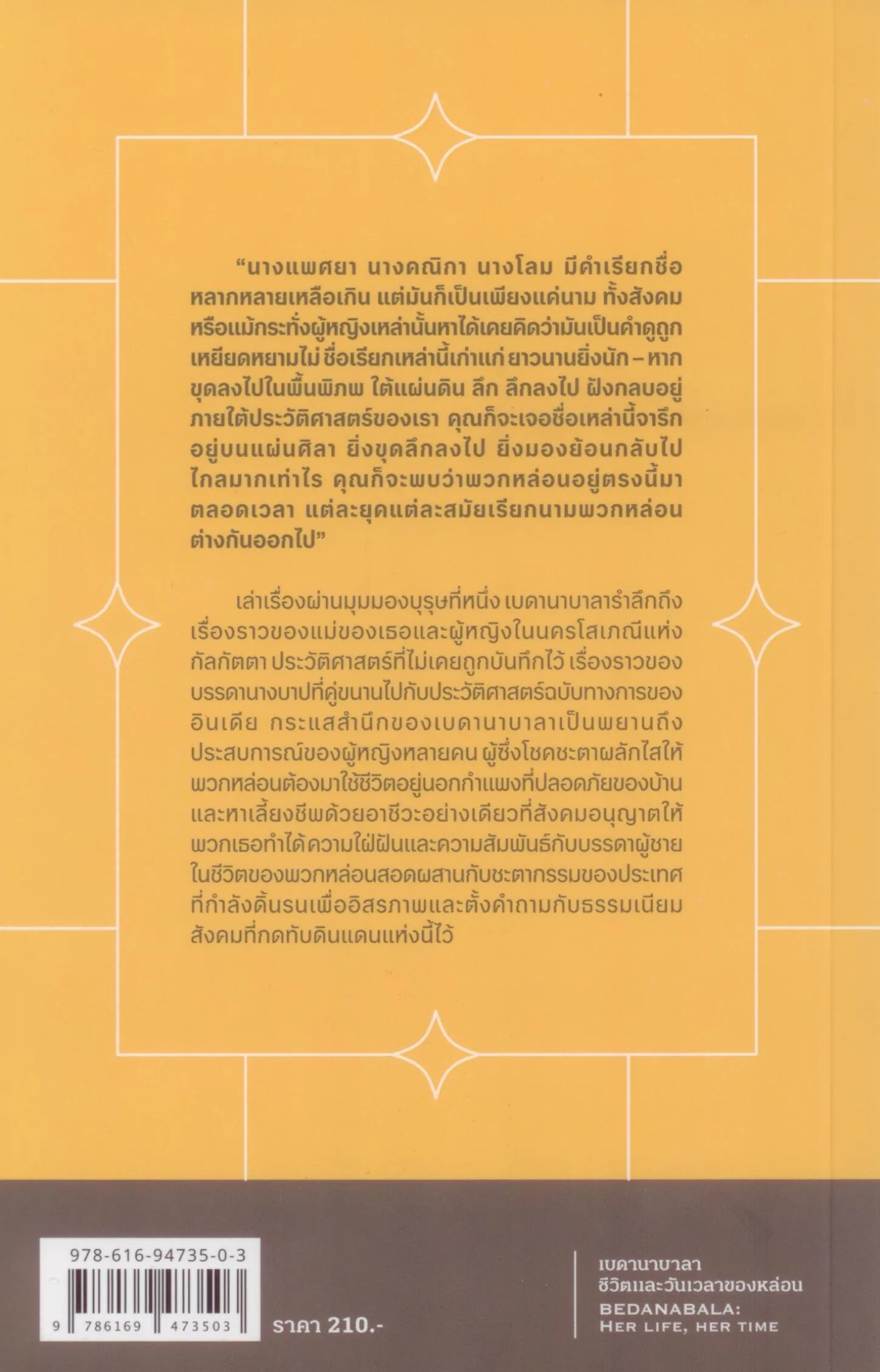 เล่าเรื่องผ่านมุมมองบุรุษที่หนึ่ง “เบดานาบาลา” รำลึกถึงเรื่องราวของแม่ของเธอและผู้หญิงในนครโสเภณีแห่งกัลกัตตา ประวัติศาสตร์ที่ไม่เคยถูกบันทึกไว้ เรื่องราวของบรรดานางบาปที่คู่ขนานไปกับประวัติศาสตร์ฉบับทางการของอินเดีย กระแสสำนึกของเบดานาบาลาเป็นพยานถึงประสบการณ์ของผู้หญิงหลายคน ผู้ซึ่งโชคชะตาผลักไสให้พวกหล่อนต้องมาใช้ชีวิตอยู่นอกกำแพงที่ปลอดภัยของบ้านและหาเลี้ยงชีพด้วยอาชีวะอย่างเดียวที่สังคมอนุญาตให้พวกเธอทำได้ ความใฝ่ฝันและความสัมพันธ์กับบรรดาผู้ชายในชีวิตของพวกหล่อนสอดผสานกับชะตากรรมของประเทศที่กำลังดิ้นรนเพื่ออิสรภาพและตั้งคำถามกับธรรมเนียมสังคมที่กดทับดินแดนแห่งนี้ไว้