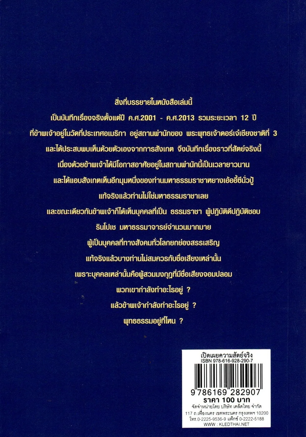 สิ่งที่บรรยายในหนังสือเล่มนี้เป็นบันทึกเรื่องจริงตั้งแต่ปี ค.ศ. 2001 – ค.ศ. 2013 รวมระยะเวลา 12 ปี ที่ข้าพเจ้าอยู่ในวัดที่ประเทศอเมริกา อยู่สถานพำนักของ พระพุทธเจ้าดอร์เจ๋เชียงชาติที่ 3 และได้ประสบพบเห็นด้วยตัวเองจากการสังเกต จึงบันทึกเรื่องราวที่สัตย์จริงนี้ เนื่องด้วยข้าพเจ้าได้มีโอกาสอาศัยอยู่ในสถานพำนักนี้เป็นเวลายาวนานและได้แอบสังเกตเห็นอีกมุมหนึ่งของท่านมหาธรรมราชาหยางเอ้ออี้ซีนั่วปู้ แท้จริงแล้วท่านไม่ใช่มหาธรรมราชาเลย และขณะเดียวกันข้าพเจ้าก็ได้เห็นบุคคลที่เป็น ธรรมราชา ผู้ปฏิบัติดีปฏิบัติชอบ รินโปเช มหาธรรมาจารย์จำนวนมากมาย ผู้เป็นบุคคลที่ทางสังคมทั่วโลกยกย่องสรรเสริญ แท้จริงแล้วบางท่านไม่สมควรกับชื่อเสียงเหล่านั้น เพราะบุคคลเหล่านั้นคือผู้สวมมงกุฏที่มีชื่อเสียงจอมปลอม พวกเขากำลังทำอะไรอยู่? แล้วข้าพเจ้ากำลังทำอะไรอยู่? พุทธธรรมอยู่ที่ไหน?