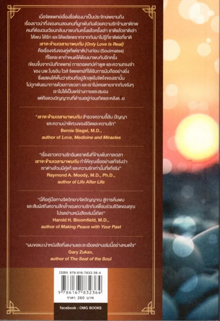 “เราจะข้ามเวลามาพบกัน (Only Love Is Real)คือเรื่องจริงของคู่แท้แต่ชาติปางก่อน (Soulmates) ที่โชคชะตากำหนดให้ต้องมาพบกันอีกครั้ง เขียนขึ้นจากบันทึกแพทย์ การถอดเทปคำพูด และความทรงจำของนพ.ไบรอัน ไวส์จิตแพทย์ที่ได้รับการนับถืออย่างยิ่ง ซึ่งแสดงให้เห็นว่าส่วนที่อยู่ลึกสุดในจิตใจของเรานั้น ไม่ถูกพันธนาการด้วยกาลเวลา และเราไม่เคยตายจากกันจริงๆ เราไม่ได้เป็นแค่ร่างกายและสมอง แต่คือดวงวิญญาณที่ดำรงอยู่ก่อนเกิดและหลังตาย!