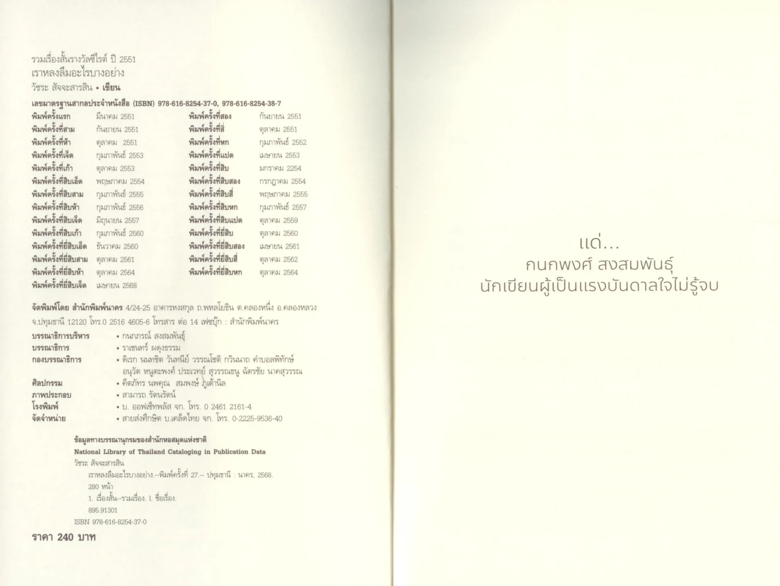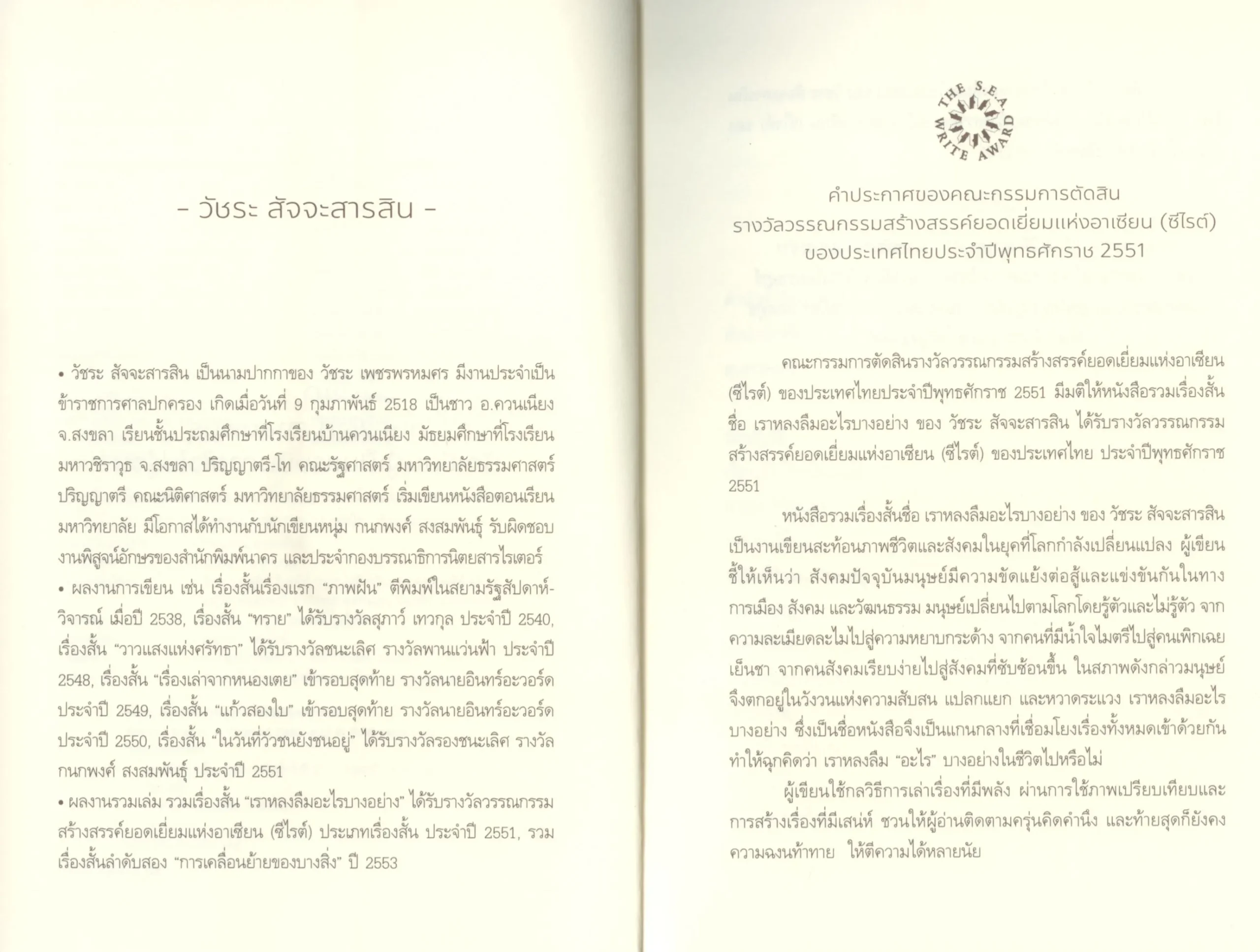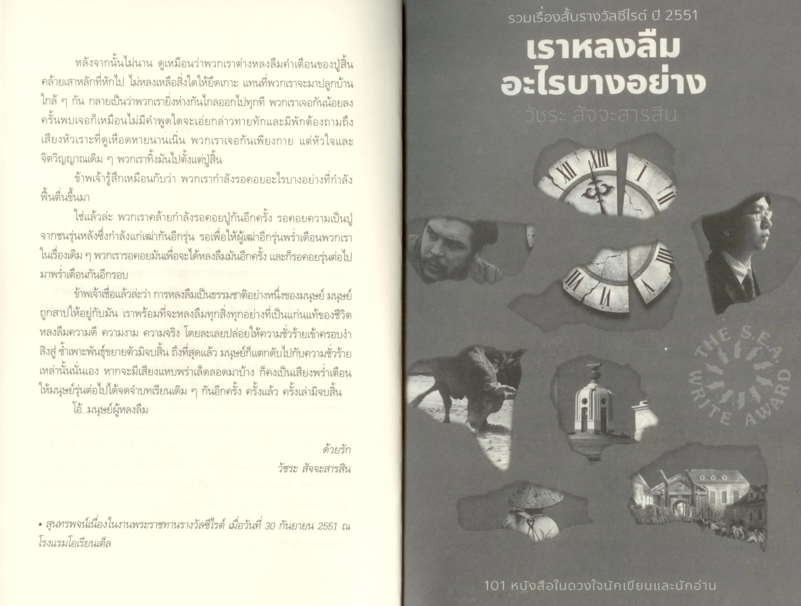 หนังสือรวมเรื่องสั้น “เราหลงลืมอะไรบางอย่าง” ของวัชระ สัจจะสารสิน เป็นงานเขียนสะท้อนภาพชีวิตและสังคมในยุคที่โลกกำลังเปลี่ยนแปลง ผู้เขียนชี้ให้เห็นว่าสังคมปัจจุบัน มนุษย์มีความขัดแย้ง ต่อสู้ และแข่งขันกันในทางการเมือง สังคม และวัฒนธรรม มนุษย์เปลี่ยนไปตามโลกโดยรู้ตัวและไม่รู้ตัว จากความละเมียดละไมไปสู่ความหยาบกระด้าง จากคนที่มีน้ำใจไมตรีไปสู่คนเพิกเฉยเย็นชา จากสังคมที่เรียบง่ายไปสู่สังคมที่ซับซ้อนขึ้น ในสภาพดังกล่าวมนุษย์จึงตกอยู่ในวังวนแห่งความสับสน แปลกแยก และหวาดระแวง “เราหลงลืมอะไรบางอย่าง” ซึ่งเป็นชื่อหนังสือ จึงเสมือนเป็นแกนกลางที่เชื่อมโยงเรื่องทั้งหมดเข้าด้วยกัน ทำให้ฉุกคิดว่า เราหลงลืม “อะไร” บางอย่างในชีวิตไปหรือไม่