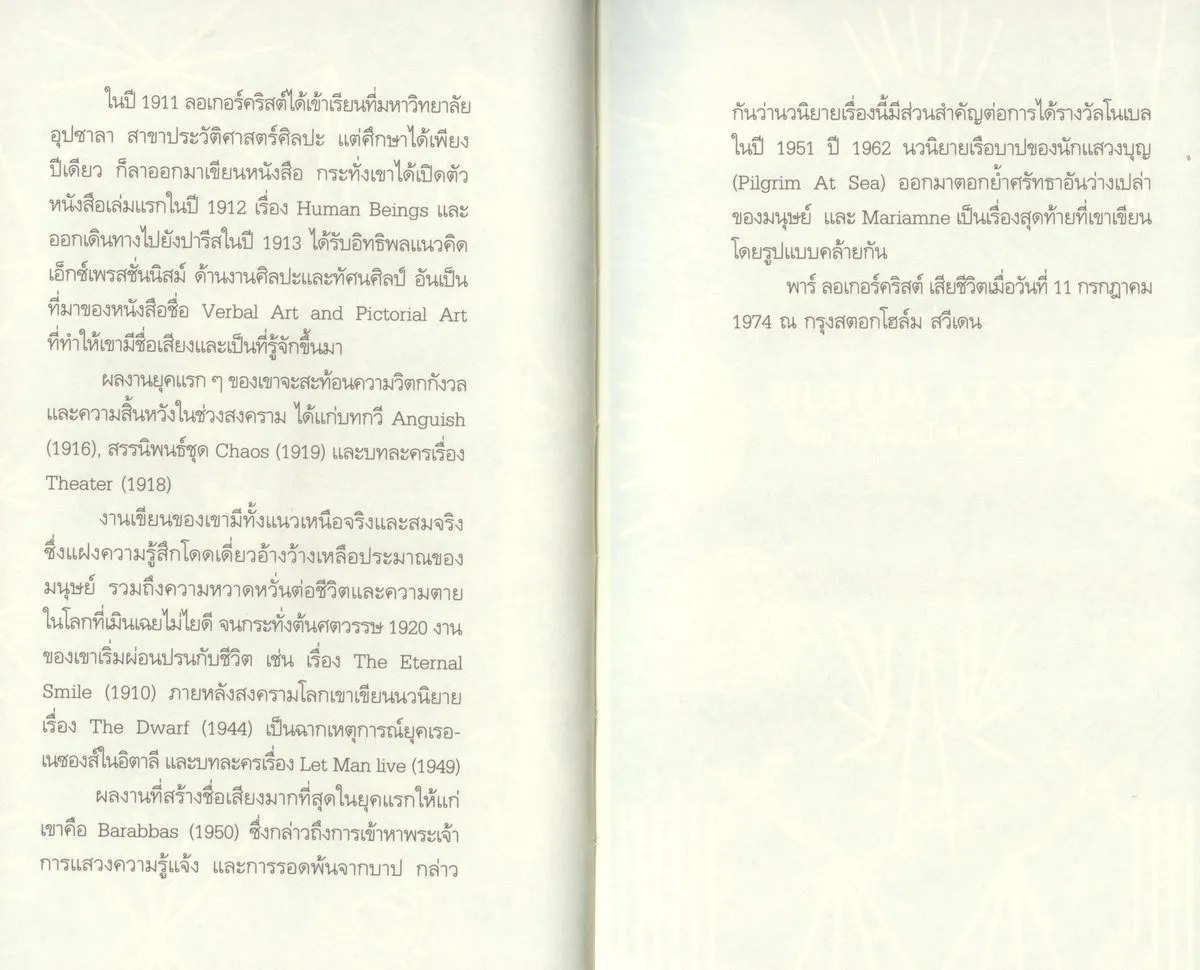 เรือบาปของนักแสวงบุญ(Pilgrim at Sea)เป็น 1 ใน 4 นวนิยายที่ได้รับการยกย่องของพาร์ ลอเกอร์คริสต์ต่อจากบารับบาส(Barabbas)ซีบิล(The Sibyl)และความตายของฮาซุเอรัส (The Death of Ahasuerus)เรื่องราวระหว่างโธเบียซนักแสวงบุญผู้พลาดจากเรือที่จะนำผู้แสวงบุญไปยังดินแดนศักดิ์สิทธิ์ต้องอาศัยเรือโจรสลัดเพื่อไปยังที่แห่งนั้นหรือว่าเขาประสงค์จะไปกับเรือโจรเพราะเมื่อเรือทั้งสองเดินทางไปทันกันโธเบียซไม่ปรารถนาจะเปลี่ยนเรือแต่กลับเดินทางไปกับโจรที่กล้าหาญพร้อมจะผจญกับคลื่นลมในท้องทะเลกว้างโดยมีโจวานนีอดีตนักบวชเป็นผู้ถ่ายทอดเรื่องราวของหนทางไปสู่ดินแดนศักดิ์สิทธิ์และศรัทธาอันว่างเปล่าของนักแสวงบุญทั้งหลาย