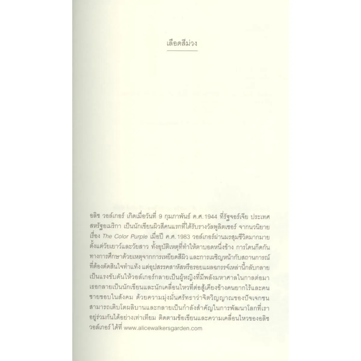 อลิซ วอล์เกอร์ (Alice Walker) เกิดเมื่อวันที่ 9 กุมภาพันธ์ ค.ศ. 1944 ที่รัฐจอร์เจีย ประเทศสหรัฐอเมริกา เป็นนักเขียนผิวสีคนแรกที่ได้รับรางวัลพูลิตเซอร์ จากนวนิยายเรื่อง The Color Purple เมื่อปี ค.ศ. 1982 วอล์เกอร์ผ่านมรสุมชีวิตมากมายตั้งแต่วัยเยาว์และวัยสาว ทั้งอุบัติเหตุที่ทำให้ตาบอดหนึ่งข้าง การโดนกีดกันทางการศึกษาด้วยเหตุจากการเหยียดสีผิว และการเผชิญหน้ากับสถานการณ์ที่ต้องตัดสินใจทำแท้ง แต่อุปสรรคสาหัสหรือรอยแผลฉกรรจ์เหล่านี้กลับกลายเป็นแรงขับดันให้วอล์เกอร์กลายเป็นผู้หญิงที่มีพลังมหาศาลในกาลต่อมา เธอกลายเป็นนักเขียนและนักเคลื่อนไหวที่ต่อสู้เคียงข้างคนยากไร้และคนชายขอบในสังคม ด้วยความมุ่งมั่นศรัทธาว่าจิตวิญญาณของปัจเจกชนสามารถเติบโตผลิบานและกลายเป็นกำลังสำคัญในการพัฒนาโลกที่เราอยู่ร่วมกันได้อย่างเท่าเทียม