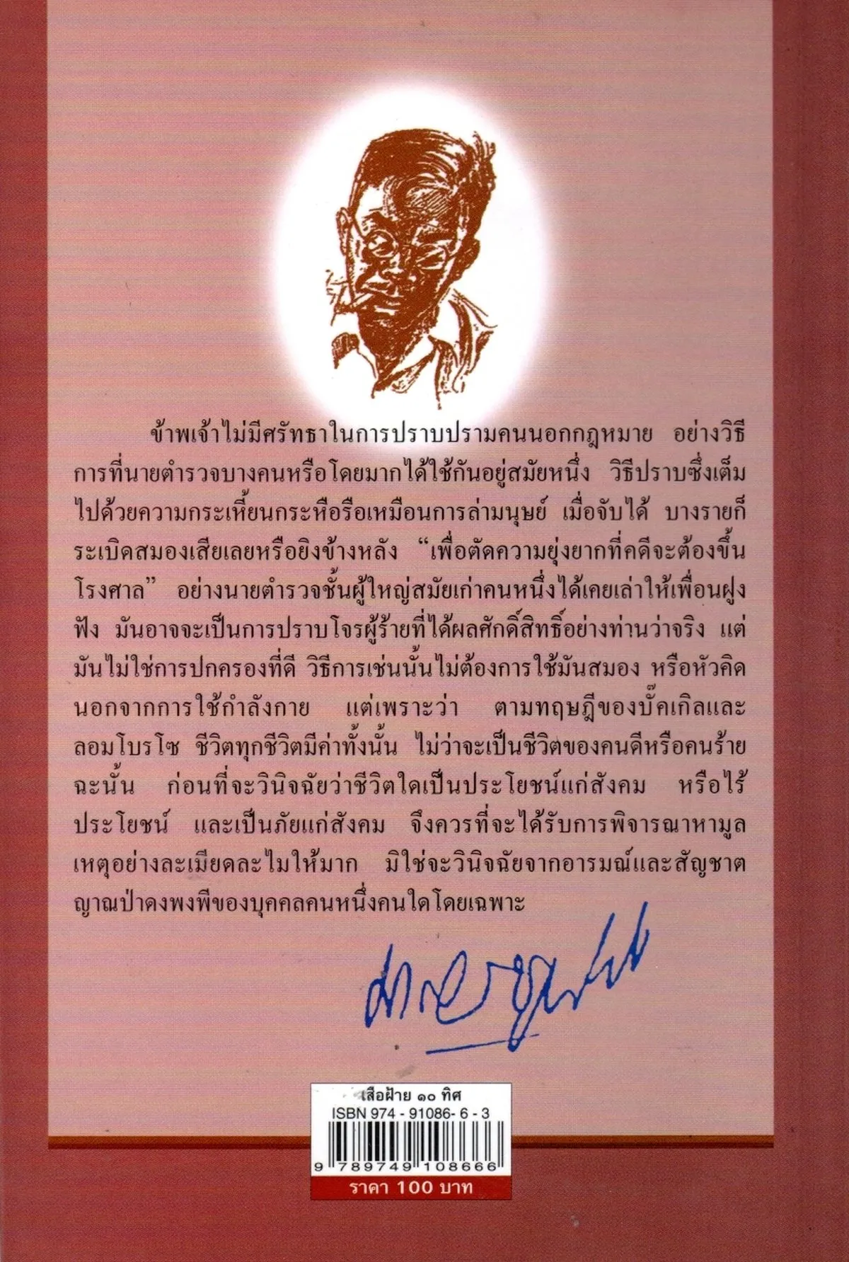ข้าพเจ้าไม่มีศรัทธาในการปราบปรามคนนอกกฎหมาย อย่างวิธีการที่นายตำรวจบางคนหรือโดยมากได้ใช้กันอยู่สมัยหนึ่ง วิธีปราบซึ่งเต็มไปด้วยความกระเหี้ยนกระหือรือเหมือนการล่ามนุษย์ เมื่อจับได้ บางรายก็ระเบิดสมองเสียเลยหรือยิงข้างหลัง “เพื่อตัดความยุ่งยากที่คดีจะต้องขึ้นโรงศาล” อย่างนายตำรวจชั้นผู้ใหญ่สมัยเก่าคนหนึ่งได้เคยเล่าให้เพื่อนฝูงฟัง มันอาจจะเป็นการปราบโจรผู้ร้ายที่ได้ผลศักดิ์สิทธิ์อย่างท่านว่าจริง แต่มันไม่ใช่การปกครองที่ดี วิธีการเช่นนั้นไม่ต้องการใช้มันสมอง หรือหัวคิดนอกจากการใช้กำลังกาย แต่เพราะว่า ตามทฤษฎีของบั๊คเกิลและลอมโบรโซ ชีวิตทุกชีวิตมีค่าทั้งนั้น ไม่ว่าจะเป็นชีวิตของคนดีหรือคนร้าย
