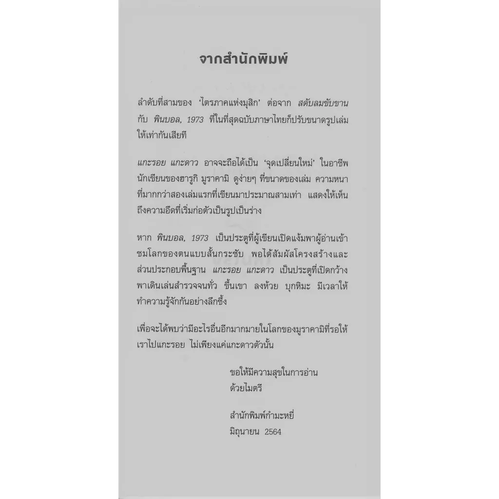 เรื่องราวซับซ้อนซ่อนเงื่อนแสดงภาพการปะทะระหว่างจินตนาการอันดิบเถื่อนกับความตลกร้าย ผลงานเขียนในวันหนุ่มของฮารูกิ มูราคามินักเขียนชื่อเลื่องระดับโลกชาวญี่ปุ่น ความสนุกประการหนึ่งในการอ่านงานเขียนของ มูราคามิ อยู่ที่การวาดภาพสิ่งที่ซ่อนอยู่เบื้องหลังโลกแห่งความเป็นจริงกับโลกแห่งจินตนาการ อันใดคือภาพที่จะปรากฏเมื่อความจริงและความฝันบรรจบ