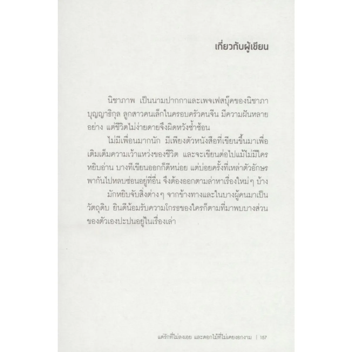 รวมเรื่องไม่รักที่เก็บเกี่ยวได้ตามฤดูกาล สร้างจากหัวใจผิดแปร่งหนึ่งดวงและดอกไม้เปียกน้ำตาที่เหี่ยวเฉาโรยราตั้งแต่ยังไม่ทันเติบโต ความเดียวดายทุบทำลายราก อกหักซ้ำซ้อน สูญเสียซ้ำซาก ไม่ประสบความสำเร็จในการมีชีวิตอยู่ ได้เพียงพยายามเลื้อยหาบ้านแท้จริงสักหลังให้ยึดเกาะไว้อย่างมั่นคง เฝ้าฝันถึงแสงแดดหลังพายุฝน พลางปลอบโยนตัวเองว่าร้องไห้ได้เสมอไม่ว่าจะอายุเท่าไหร่