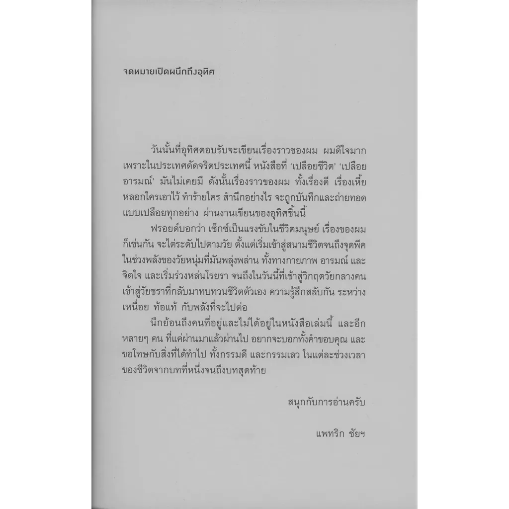 “นี่คือเรื่องราวหลั่งไหลทางเพศ ผมพบว่าตัวเองโตกว่าวัยของตนเสมอ อยู่ในสายตาของคนโตๆ อยู่ในแวดล้อมของคนใหญ่คนโต เหมือนไม่ได้อยู่กับช่วงเวลาจริงๆ ตรงหน้า แต่ได้รับมอบเวลาอนาคตมาใช้ก่อน เป็นกลุ่มคนที่ได้อยู่ใกล้และได้ใช้ความรู้ ความก้าวหน้า เทคโนโลยีและวัฒนธรรมที่กำลังเปลี่ยนแปลงมีโอกาสก่อนอีกชนชั้น ในขณะที่คนอื่นๆ อยู่กับช่วงเวลาปัจจุบัน ถ้าหากว่าพวกเขาเพิ่งเกิด ผมรู้สึกว่าตัวเองเกิดมาห้าขวบปีแล้ว ถ้าหากพวกเขาอยู่ชั้นมัธยมหนึ่ง ผมก็รู้สึกว่าตัวเองกำลังใกล้จะจบชั้นมัธยมปลาย ถ้าหากว่าพวกเขาฝันใฝ่ถึงการเดินทางท่องเที่ยวด้วยรถไฟ ผมก็มีสมุดตั๋วเครื่องบินอยู่ในมือและนั่งมองบ้านเมืองจากมุมสูงๆ บนเครื่องแล้ว ผมชักว่าวเป็นตั้งแต่อายุเก้าขวบ ผมถูไถกระเจี๊ยวตัวเองกับขอบเตียงระหว่างมือพัวพันเป็นปลาหมึกกับเรือนร่างสาวใช้ที่นั่งดูทีวีอยู่ตรงปลายเตียง ค้นพบความเสียวซ่านไร้จุดจบ แล้วอยู่ดีๆ วันหนึ่งมันก็ลั่นเปรี๊ยะมีน้ำใสไหลออกมา ผมตีหม้อครั้งแรกตอนชั้นมัธยมหนึ่ง มีคู่นอนคนแรกเป็นอาอี๊ เพื่อนซี้ของม้าช่วงฤดูร้อนของมัธยมสี่ แต่อยากจะขอย้อนกลับไปวัยเด็กกว่านั้นอีกสักนิด ผมรู้จักสายตาเกิน ‘เอ็นดู’ ของเพื่อนๆ ป๊ากับม้า สายตาโลมเลียของมาสเตอร์โรงเรียนชั้นมัธยม สายตาที่อยากจะกินผม พร้อมกับนาบมือสัมผัสลูบไล้ขาอ่อนผมเวลาเรียกเข้าไปห้องพักครู การกัดริมฝีปากและทำเสียงดูดลอดไรฟัน ผมรู้สึกว่าเขาอยากกินผม และลึกๆ อย่างหวั่นๆ ผมก็อยากให้พวกเขากิน แต่เราก็ต่างอยู่ตรงกึ่งกลางของความหักห้ามใจ ได้แต่ฝากริมฝีปากเผยอและเสียงดูดลมลอดไรฟันแสดงออกถึงความใคร่อยากออกมาแทน”