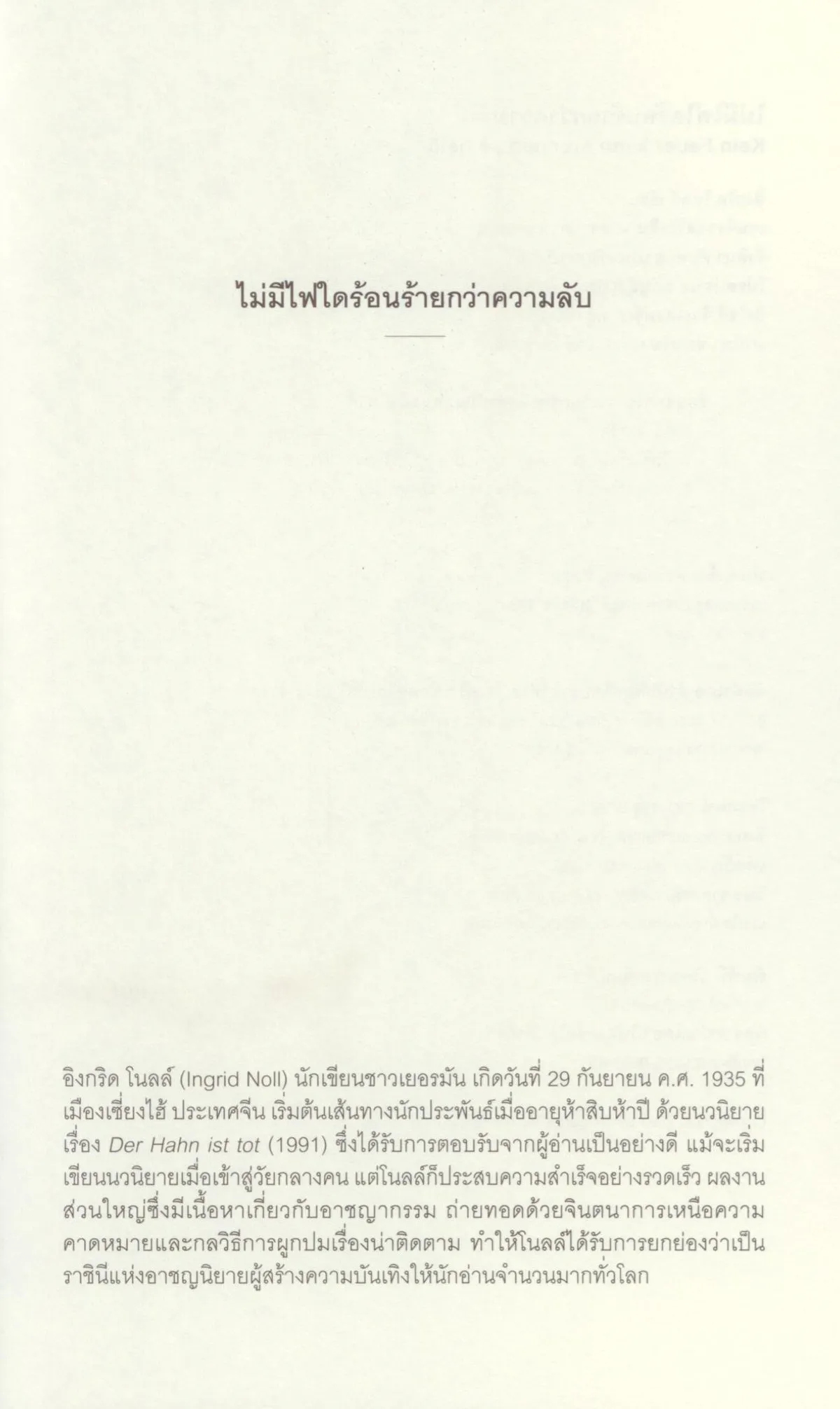 ไม่มีไฟใดร้อนร้ายกว่าความลับ (2021) ความสัมพันธ์สุดเร้าใจของเหล่าลูกจ้างที่ให้การพยาบาลเจ้านายฐานะมั่งคั่ง ผลงานของอิงกริด โนลล์ นักเขียนชาวเยอรมันรวยอารมณ์ขันและได้ชื่อว่าเป็นราชินีแห่งอาชญนิยาย